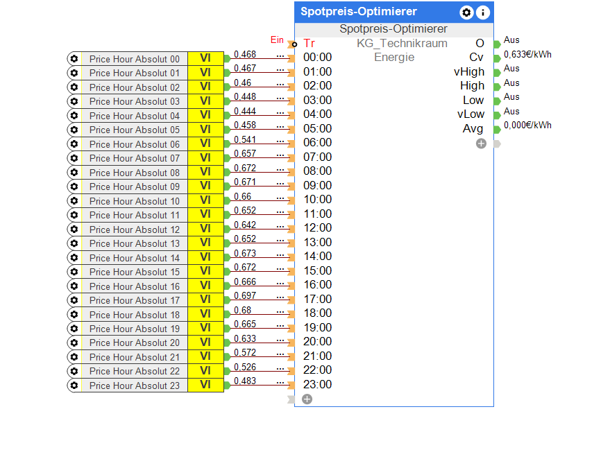 Ob die Preise mit oder ohne Abgaben ausgegeben werden ist für die Funktion des Bausteins (Verbrauch wenn es am günstigsten ist) egal. Und wenn der Baustein um einen "Kostenzähler" ergänzt wird könnte man immer noch die 24 Preise an den Eingängen mit einer Formel "anpassen".