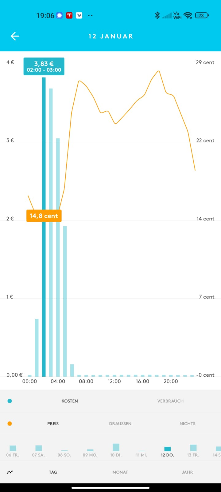 Ich protokolliere ja die Preise aktuell bei Tibber und das sieht nicht so dolle aus, gestern und heute: Minimum 45ct/kwh Maximum 71ct/kwh. Bin immernoch am Kämpfen mit mir, ob ich nicht bleibe bei 42ct/kwh bei meinem Stromanbieter.