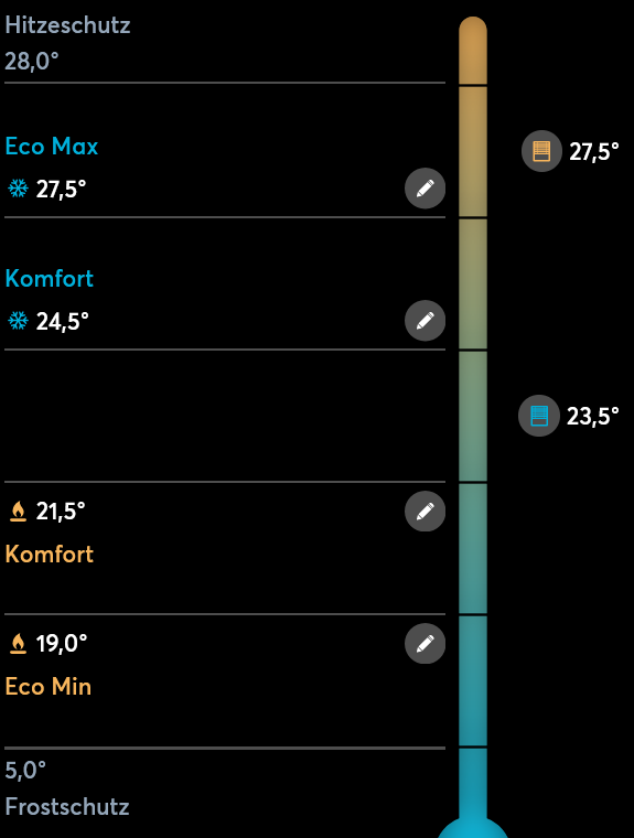 Wenn ich die Sim anschlate springt er auf 21,5, das ist die komforttemp. aber eigentlich Falsch... hier müsste der Mittel zwischen Komfort Kühlen und Heizen stehen