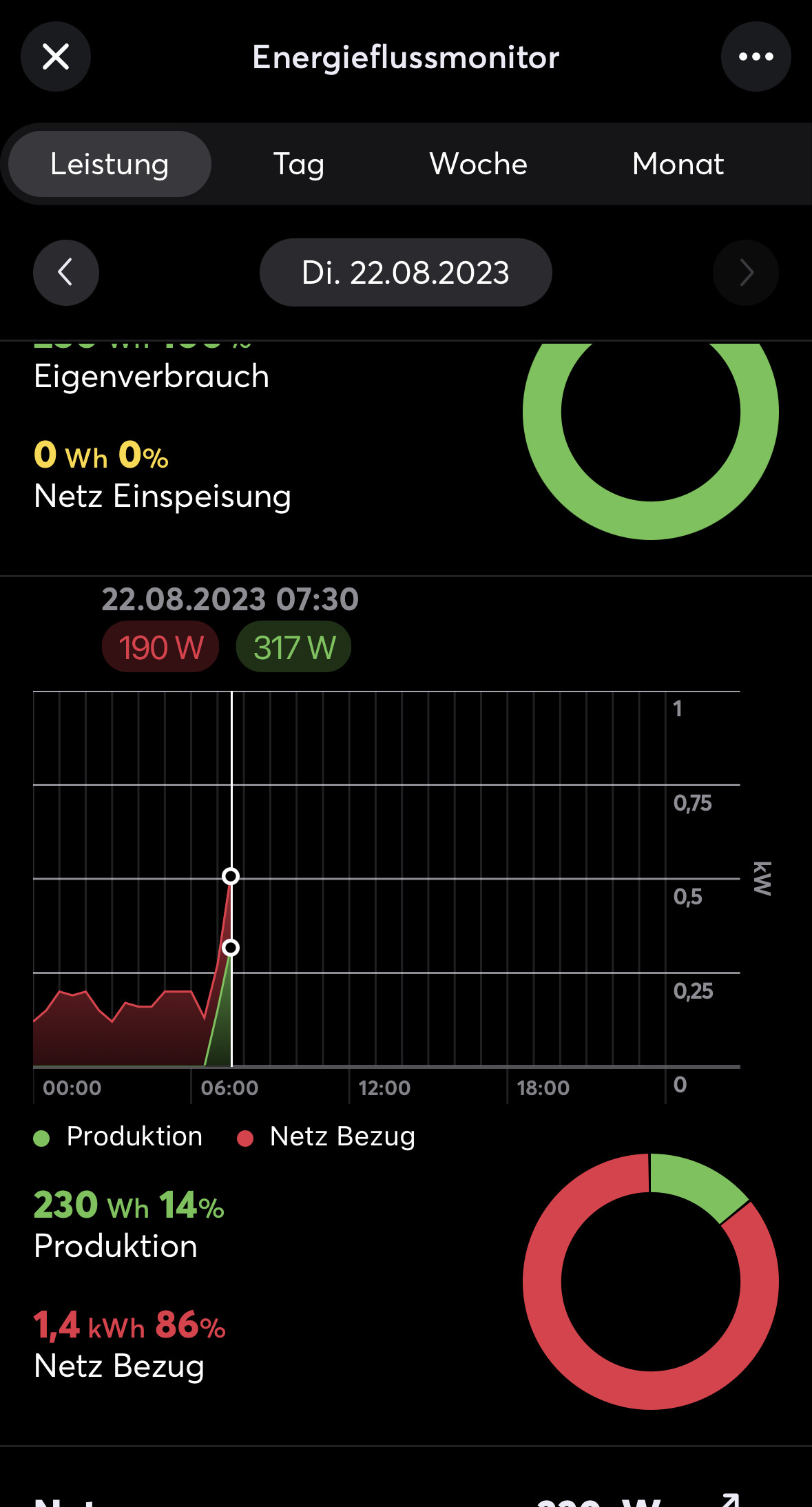 Dazu mal ein Bild: Produktion zeigt 317W und Netzbezug 190W. Die Grafik stellt den Netzbezug allerdings mit ca. 500W dar, was eben die Summe der beiden genannten Zahlen wäre.