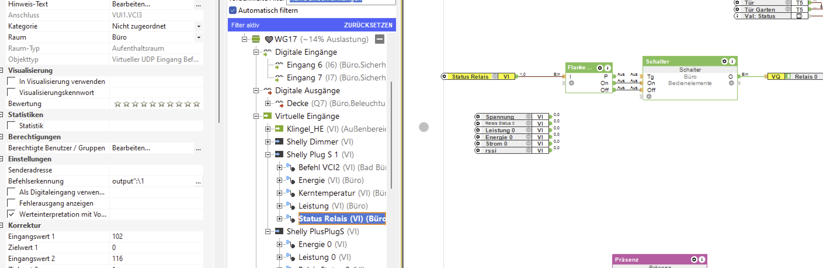 Der Baustein hat die Shelly-URL hinterlegt und Ausgang O hat die Befehle für ein/aus hinterlegt.