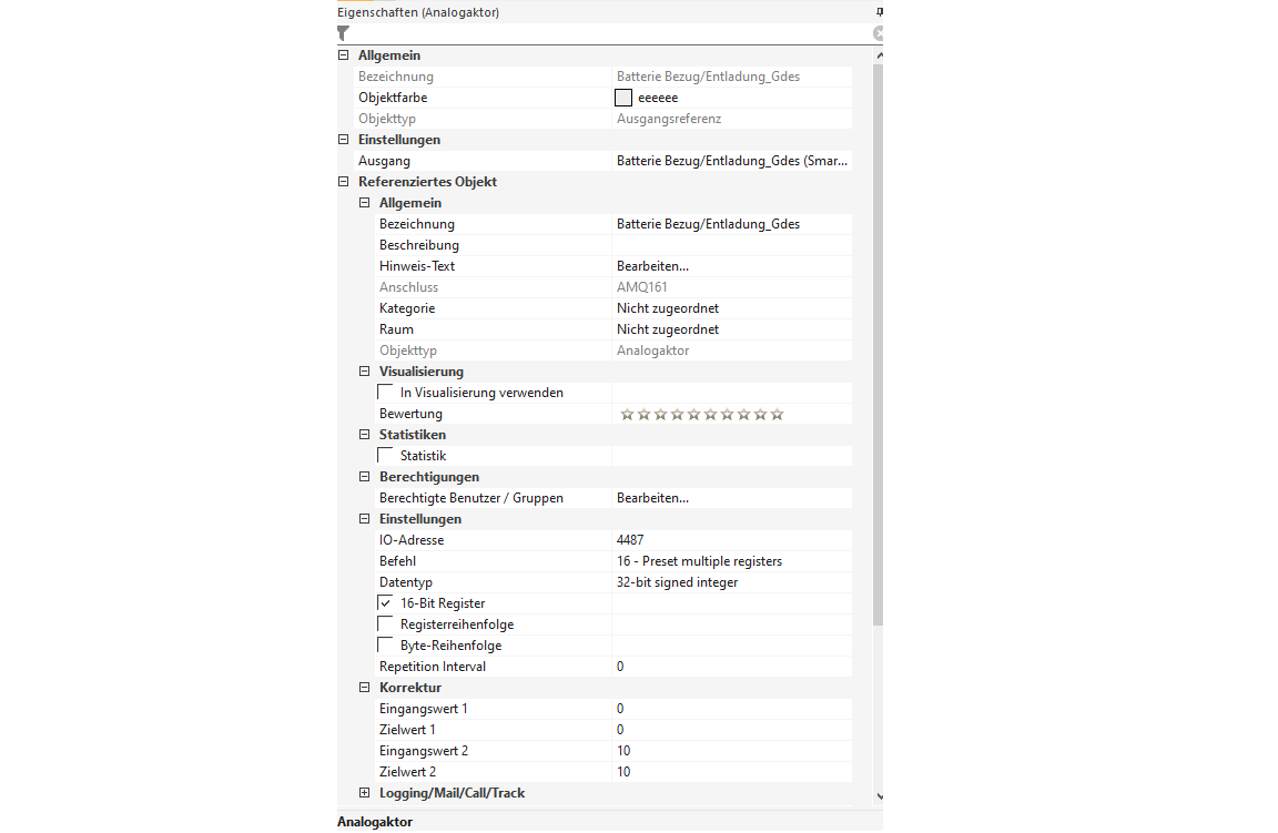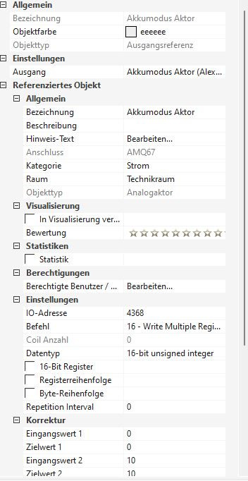 Da ich es mit Loxone nicht schaffe, diese Parameter zu verändern bzw. gleichzeitig in mehrere Register zu schreiben, schalte ich nun nur zwischen Nutzungszeitmodus (1) und Self-Use Modus (0) hin und her. Das funktioniert ganz gut. Die Ladeleistung kann ich zwar nicht variieren, das stört aber nicht wirklich. Die habe ich nun fix eingestellt auf 8kW. Der Register den ich als Aktor nutze ist Nr. 4368.