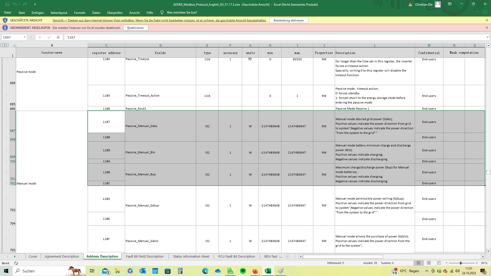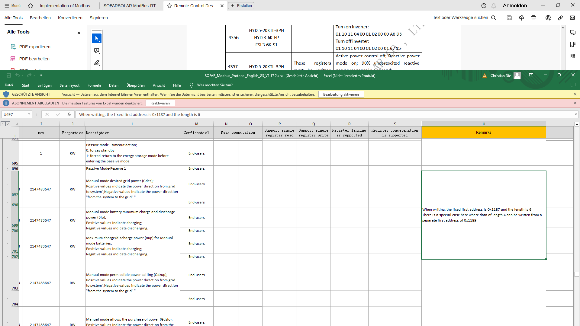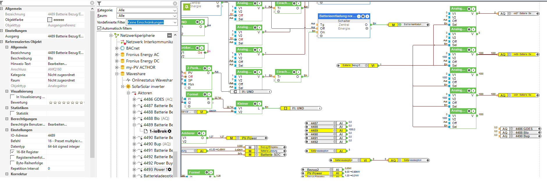 It is not so easy to map all changed parameters. Of course I tried all registers as suggested. also individually as 16-bit variants. Only with the 64-bit setting does something happen. Screenshot 1 drained the battery, screenshot 2 powered the battery from the mains and screenshot 3 shows no effect. but when unloading and loading this happened with the non-specified values. I know it may be asking a lot, but would it perhaps be in your interest if you could take a look at it yourself remotely? Maybe I'm just missing something? Thank you for your commitment! oh and about the addresses. I can create the ones that can be read correctly as normal. without deducting a spot. When writing the values, I also tried subtracting the addresses by one place. but unfortunately it didn't do anything.
