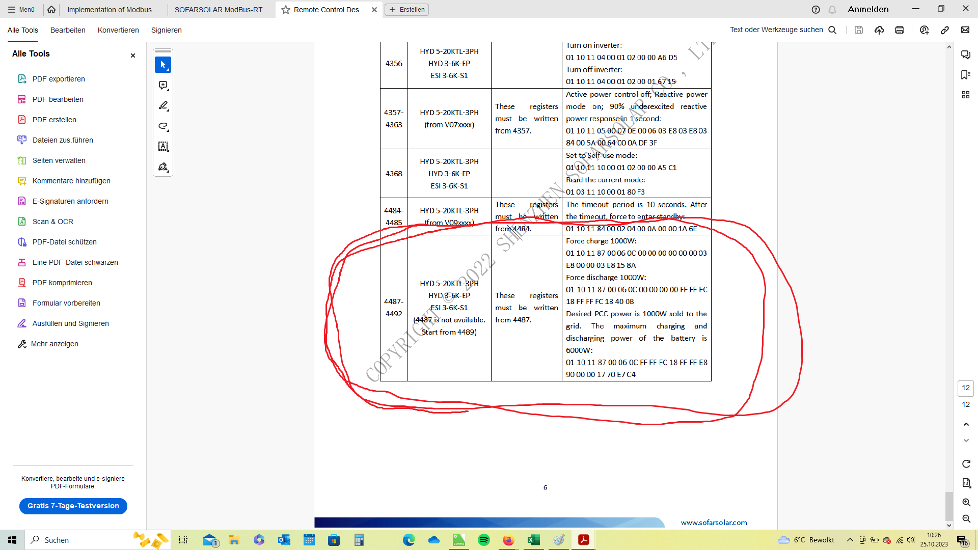 The following description is applicable to the 'Force Charge 1000W'. The green highlighted area are the Hex values that would be sent from an RS485 Extension. This matches the Excel information you posted earlier in the 'Manual mode' for Modbus commands.