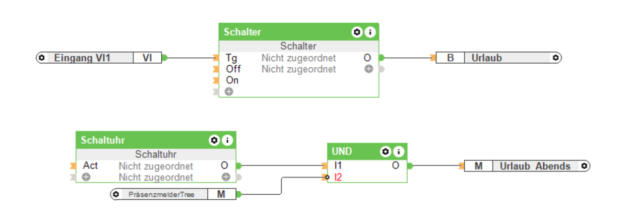 Damit hast Du erreicht, dass die Schaltuhr nur wenn der Betriebsmodus "Urlaub" aktiv ist zu den gewünschten Zeiten auf ON steht. Den Rest kannst Du mit UND lösen: