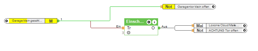 Realisiert wie oben- in der Einschaltverzögerung habe ich die 30 Minuten eingestellt, allerdings habe ich keinen Baustein gefunden, der mir die Einschaltverzögerung abschaltet, wenn das Tor vor Ablauf der 30 Minuten geschlossen wird - ich erhalte also immer die Warnung, dass das Tor noch immer offen ist: