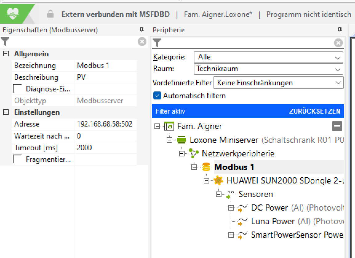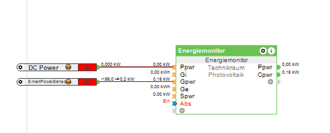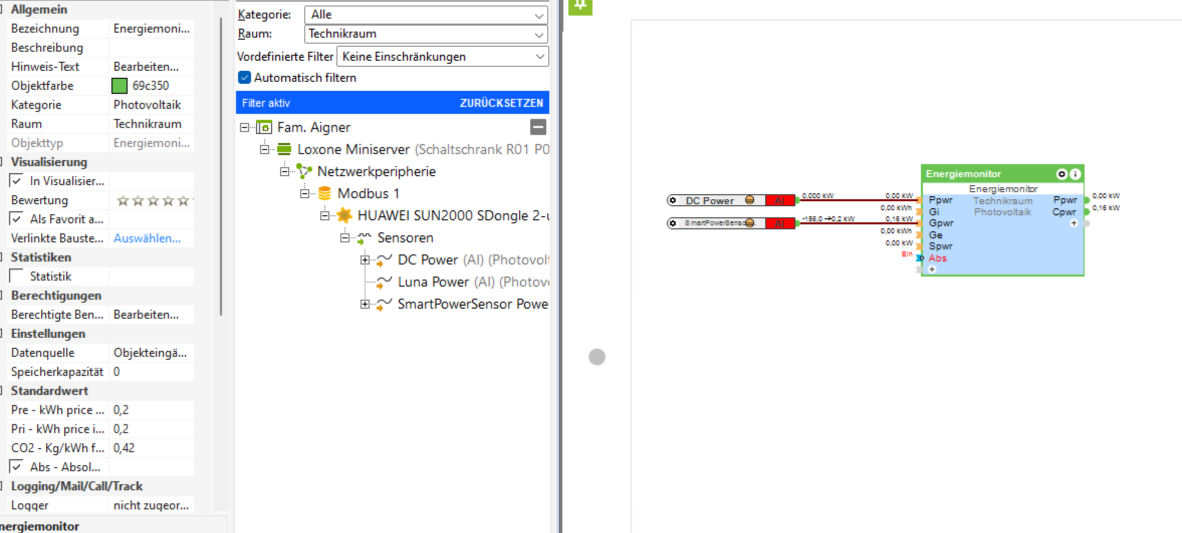 Das Template von der Loxone Library wurde bereits erfolgreich eingefügt. Weiters wurde auch der Energiemonitor mit dem Eingang DC Power sowie dem SmartSensorPower verknüpft.