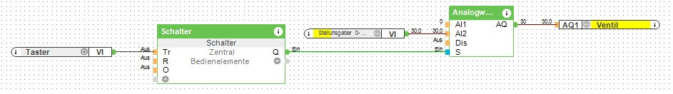 am Analogwahlschalter dann einfach bei V1 die IRR anhängen und V2 den Wert fix angeben den du willst also 3 für 30% weil der Stellantrieb das 0-10 Signal in Prozent umwandelt.