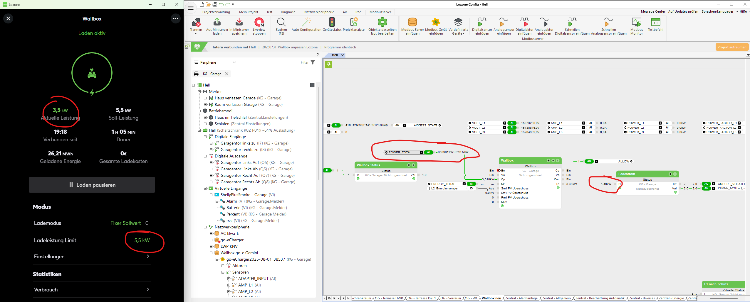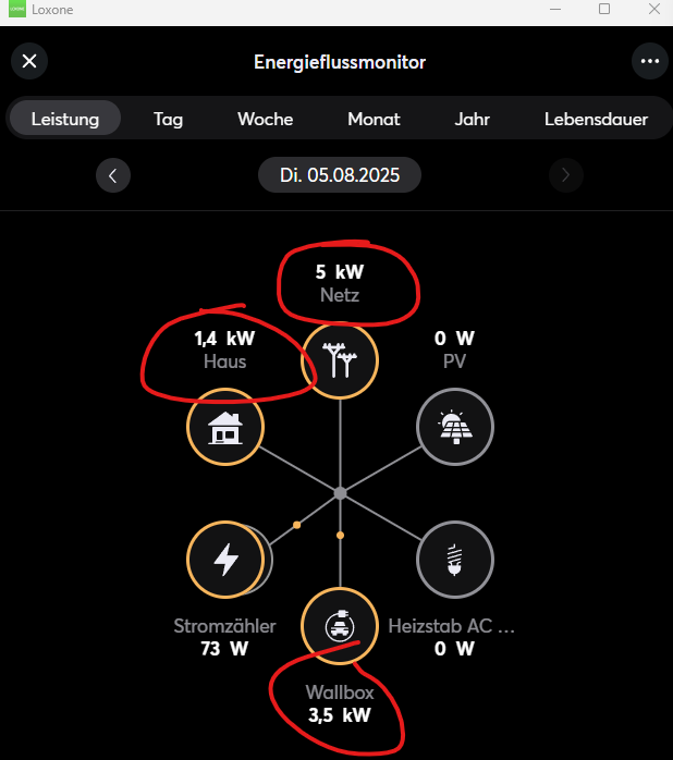 So sieht es im Energieflussmonitor aus. Das Netz liefert 5 kW, also können die eingestellten 5,5 kW auch nicht stimmen - womit ich den Wallbox Baustein im Visier habe, aber da konnte ich nichts passendes finden.