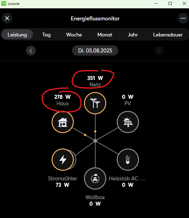 Dieser Wert müsste hinkommen, weil wenn ich das Laden beende, verbraucht das Haus ca. 350 Watt.