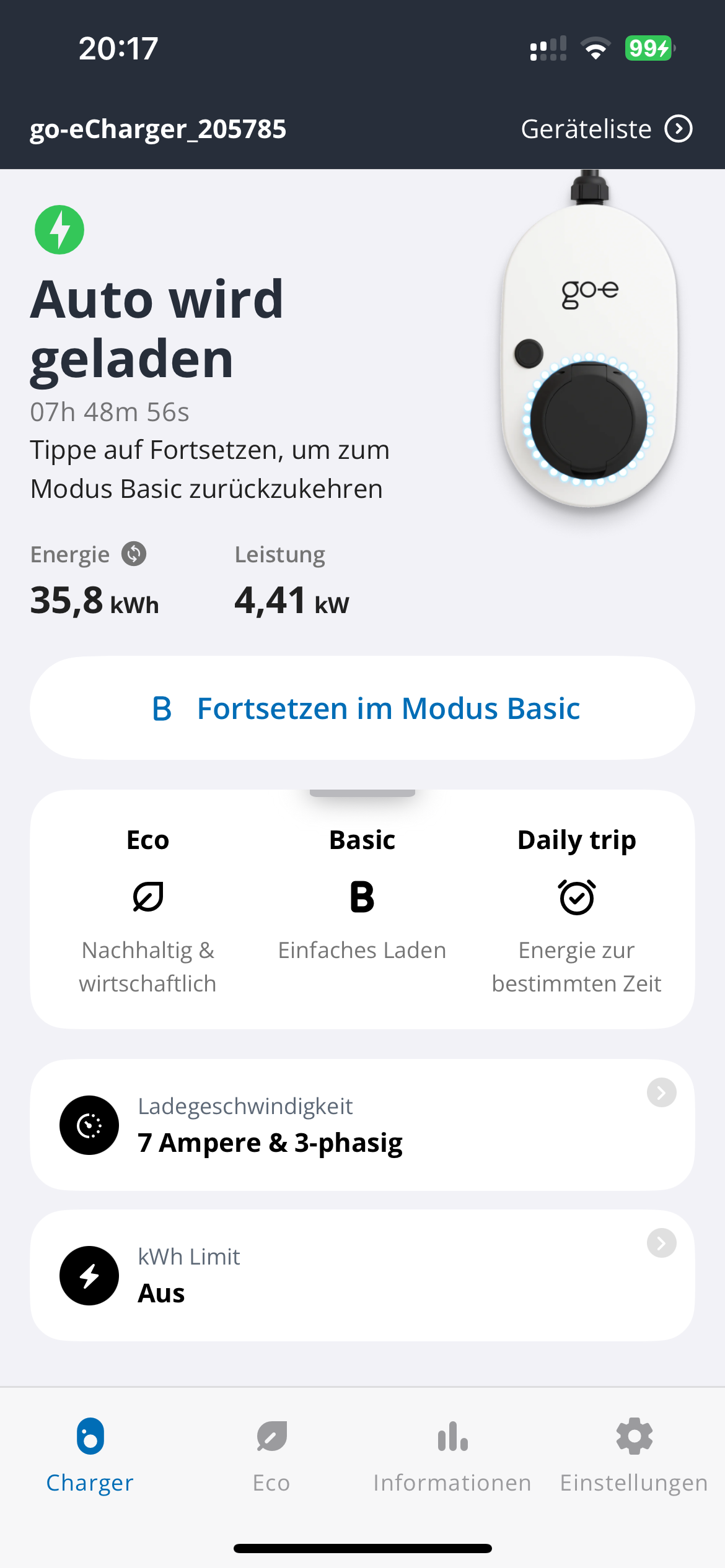 Laut go-e App kommen beim Auto 4,41 kW an.