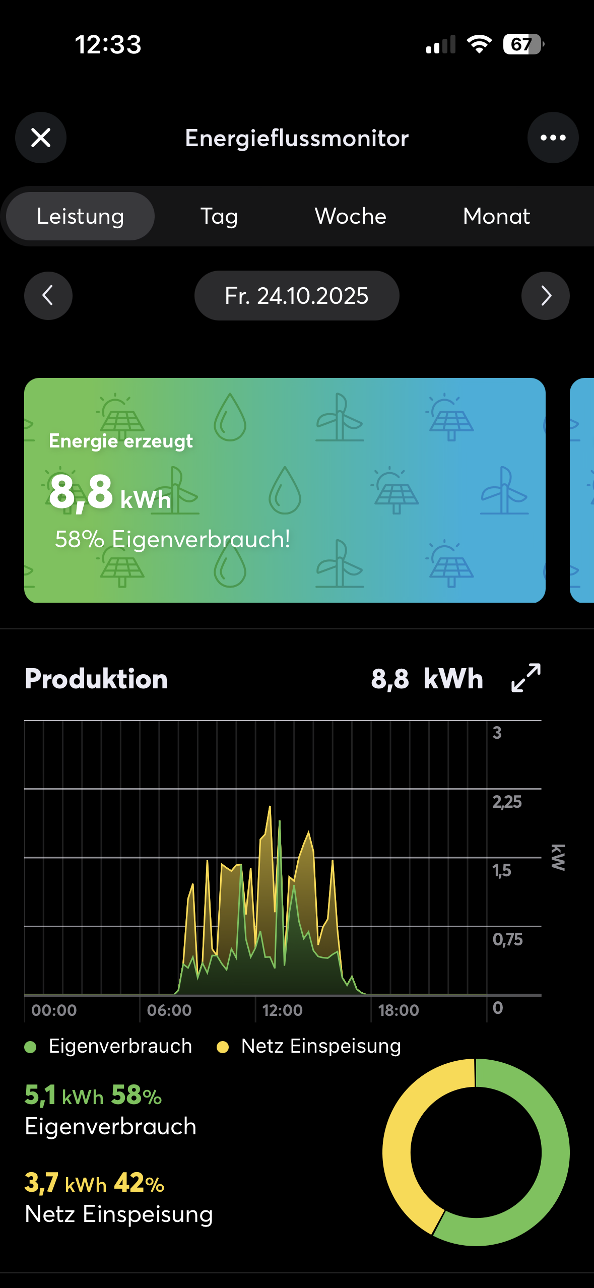 Der ganze Energieflussmonitor könnte eine Überarbeitung brauchen. Eigenverbrauch interessiert mich weniger, Autarkie wäre für mich Interesssanter. Wäre nett diese Felder anpassen zu können. Das Sterndiagramm könnte auch mehr als 6 Ringe vertragen. In der Produktion/Verbrauchssringen könnte ein Prozentsatz stehen damit dieser Raum genutzt wird.