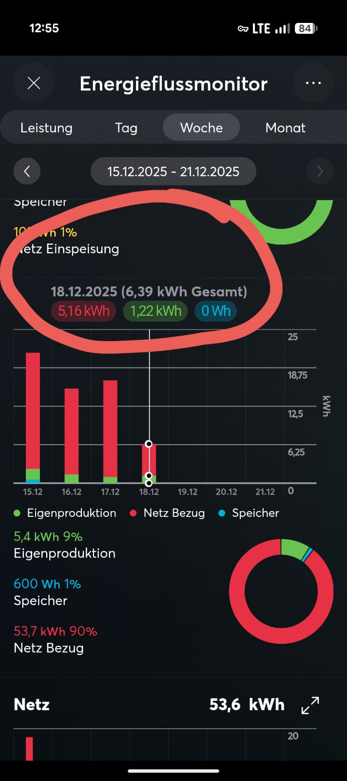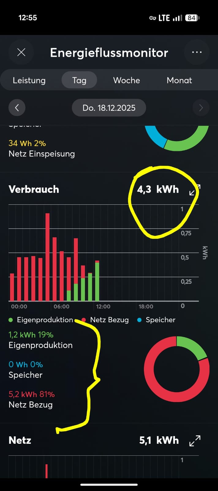 Dieser Fehler tritt nur auf (aber nicht immer), wenn es ein paar Sekunden dauert, bis die Werte vom MS abgerufen wurden. Bevor die Werte weiter unten angezeigt werden, wird der Eigenverbrauch in % oben bereits falsch bzw. mit 0% angezeigt. Für den gleichen Tag tritt der Fehler aber nachfolgend nicht mehr auf, wenn man vor- oder rückwärts die Tage gewechselt hat. Die Werte für diesen Tag werden bei wiederholten Aufrufen sofort angezeigt, selbst wenn man mehrere Monate tageweise zurückgeht.