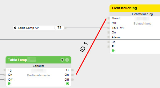 Ziel wäre, via «On» (oder «O») die ID <1> an den Eingang «Mood» der Lichtsteuerung zu senden.