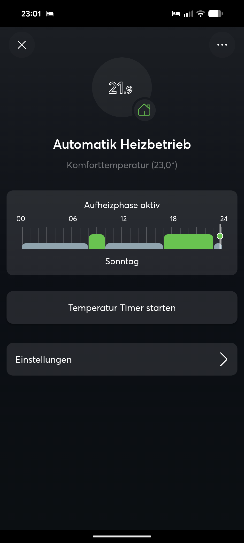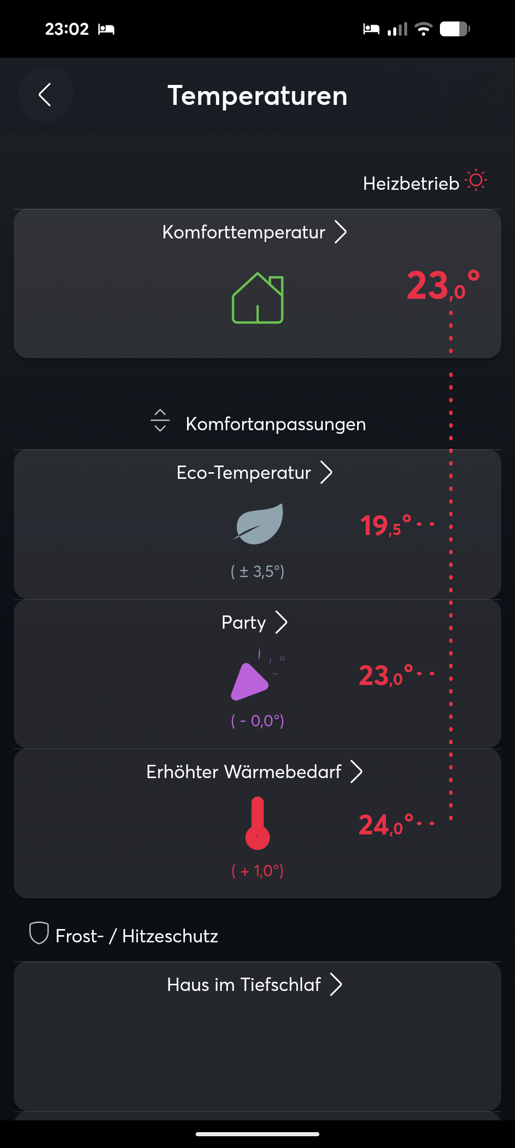 Wie die 2angehängten Screenshots der Loxone App belegen, bin ich aus der Komfort-Temperaturzeit (23*) raus und die Eco-Temperatur (19*) sollte jetzt die Solltemperatur sein. Leider ist aber die Solltemperatur immernoch 23*. Und auch wenn ich nachts aufstehe ist die Solltemperatur 23*. Was stimmt da nicht? Kann mir jemand helfen?