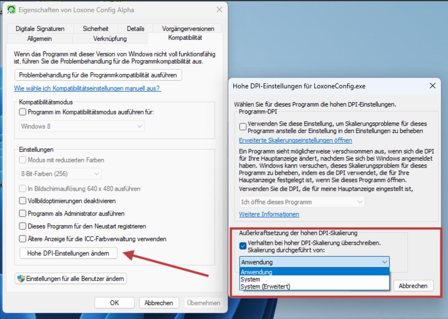 • Rechtsklick Loxone Config Verknüpfung -> Eigenschaften -> Kompatibilität -> Hohe DPI-Einstellungen -> "Verhalten bei hoher DPI-Skalierung" Haken setzen und "Anwendung" auswählen, siehe Screenshot anbei.