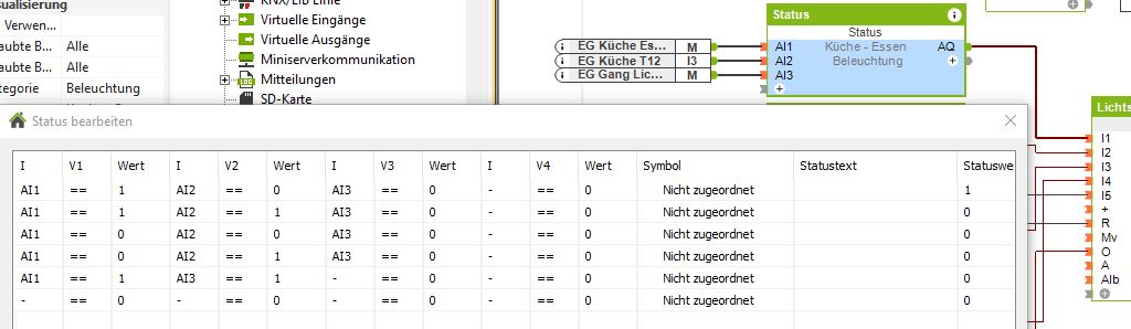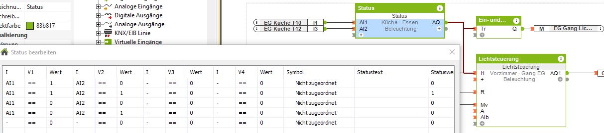 Auch bei der Einzeltaste verwende ich den Status Baustein und den Merker. Damit habe ich auch kein Problem, wenn einmal eine Taste früher losgelassen wird als die andere.