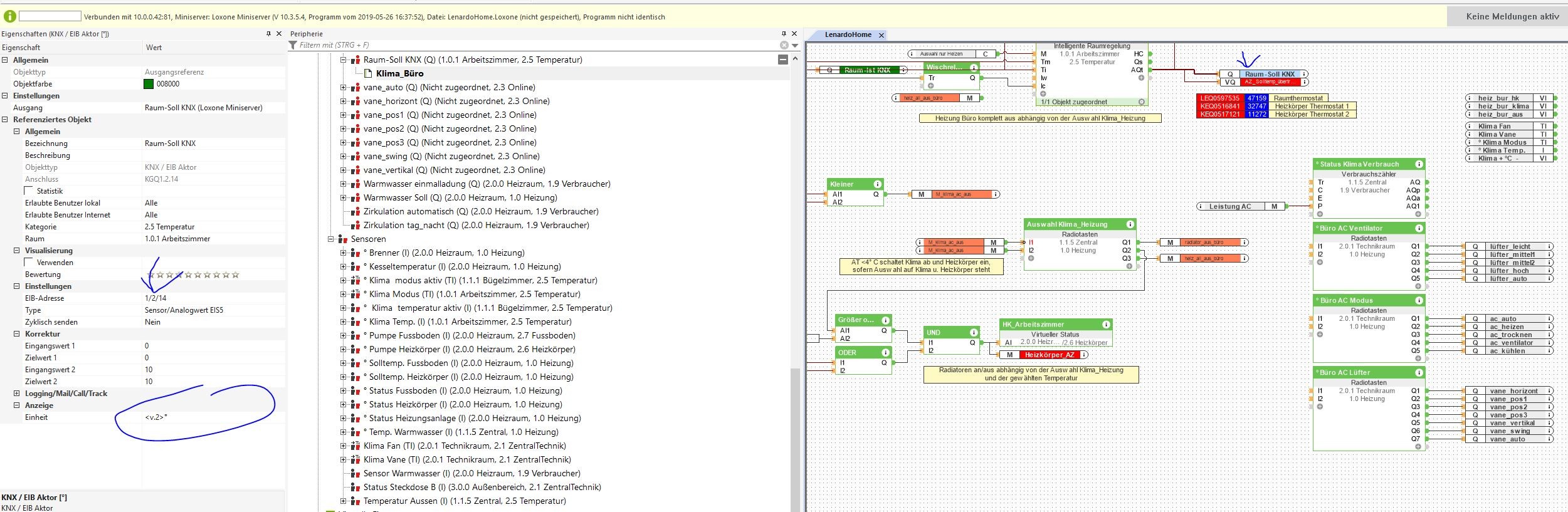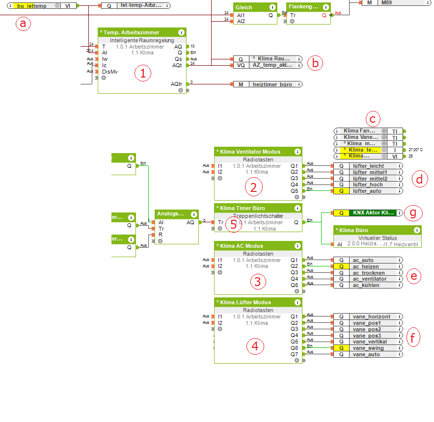 Und zuletzt hab ich die aktuelle Raumtemperatur auf einen IRR gelegt und an KNX übergeben, sowie den Ausgang soll Temp. auch auf Knx übergeben, damit regelt die Klima dann auf die gewünschte Temperatur bzw. ich "entfeuchte" auch einen Waschraum damit,- Klima auf "auto" und mit der temp. wird dann entweder geheizt oder entfeuchtet.