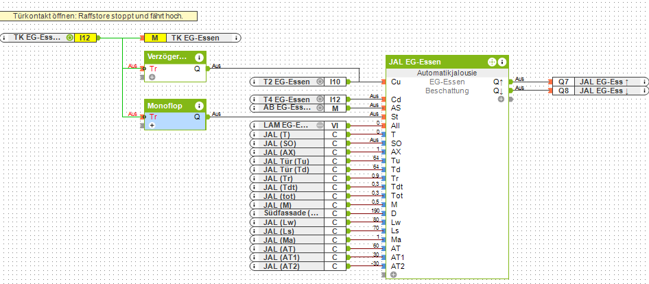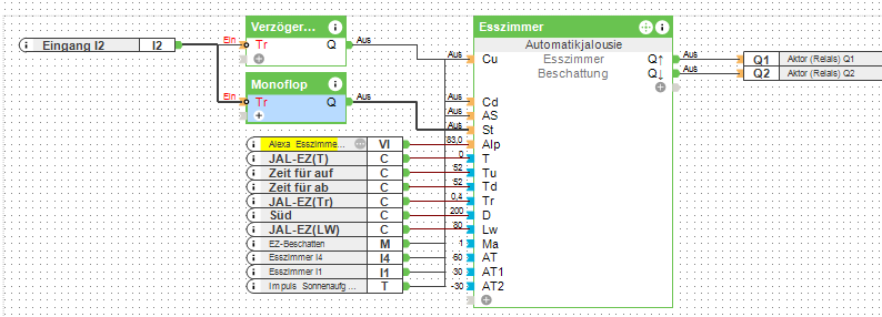 sorry ich habe mich verschrieben, natürlich brauch ich einen Dauerimpuls auf Q1, damit die Jalousie nach oben fährt, wenn der Impuls nach dem Sonnenuntergang zum Schliessen der Jalousien kommt. Du sagst, dass wenn Eingang I2 auf AUS ist, dann fährt die Jalousie nach oben, merkwürdig.. Bei mir ist es irgendwie umgekehrt! In meinem Beispiel, ist die Tür geöffnet und somit I2 auf EIN.