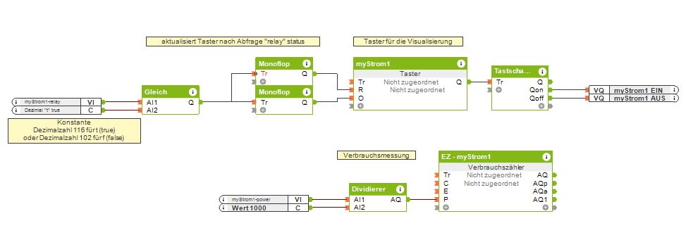 Das ganze an einem Verbrauchszähler zur Strommessung sowie für die Statistik und weiter die Logik damit ich einerseits über Loxone ein- und ausschalten kann und Loxone aktualisiert wird wenn ein/aus über andere Schnittstellen (myStromWeb/App) getätigt wird.