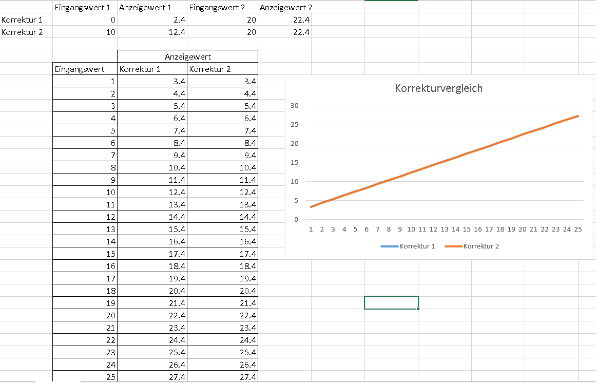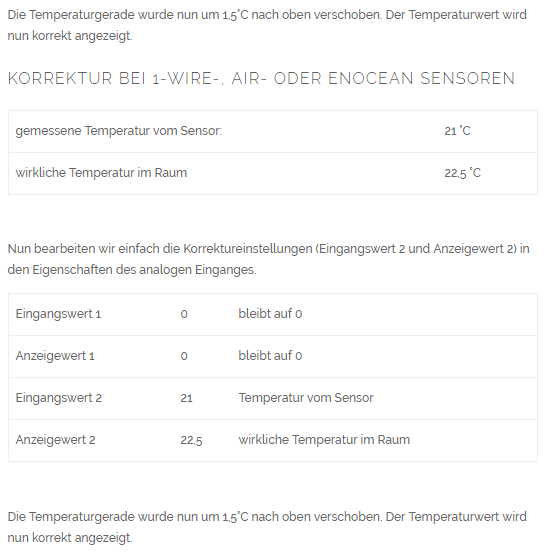 Bei der Korrektur von Temperatursensoren (Gira Tastsensor) komme ich aber an meine Grenzen. Die korrekte Temperatur ist ermittelt und die Werte in den Eigenschaften (Eingangswert 1: 0; Zielwert 1: 2,4; Eingangswert 2: 20; Zielwert 2: 22,4) hinterlegt. Der Sensor zeigt mir aber weiter die alte (falsche) Temperatur an.