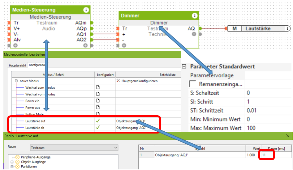 ich würde gerne den Medien-Steuerungsbaustein einsetzen. Ich habe mal versucht, die Lautstärke damit zu ändern (per Virtuellem Ausgang). Irgendwie bekomme ich es aber nicht hin, die Lautstärke sich ändert. Wie muss ich den Baustein richtig programmieren?