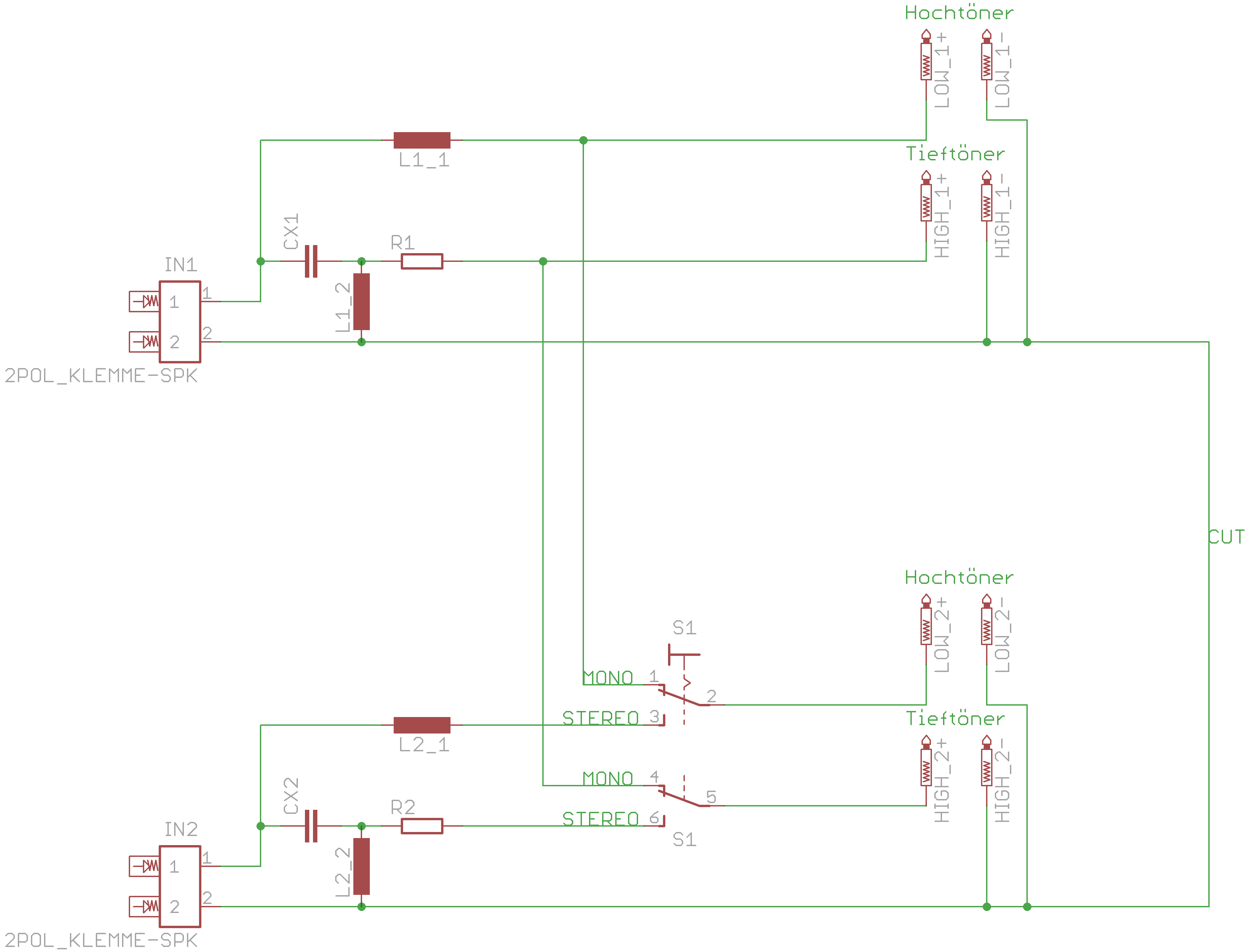 Das Problem ist, das auf der Platine der Frequenzweiche/StereoMono-Umschaltung einer Seite der Eingangsklemmen und eine Seite aller Lautsprecher (Hochton links Hochton rechts, Bass) fest zusammen geschaltet sind. Man hat darauf verzichtet einen größeren mehrpoligen Schalter zu verwenden um beide Seiten der Anschlüsse entsprechend ein/aus schalten zu können.