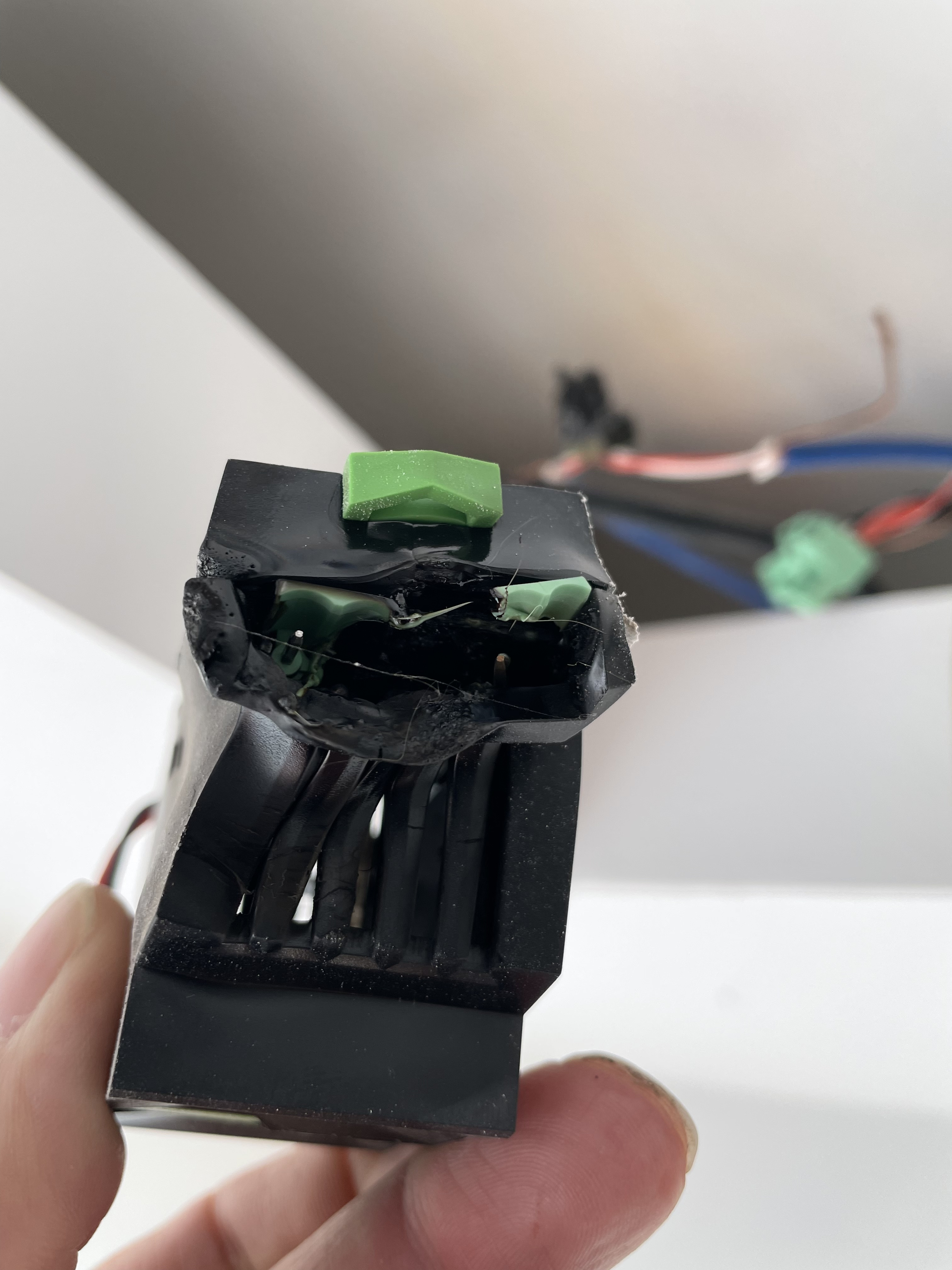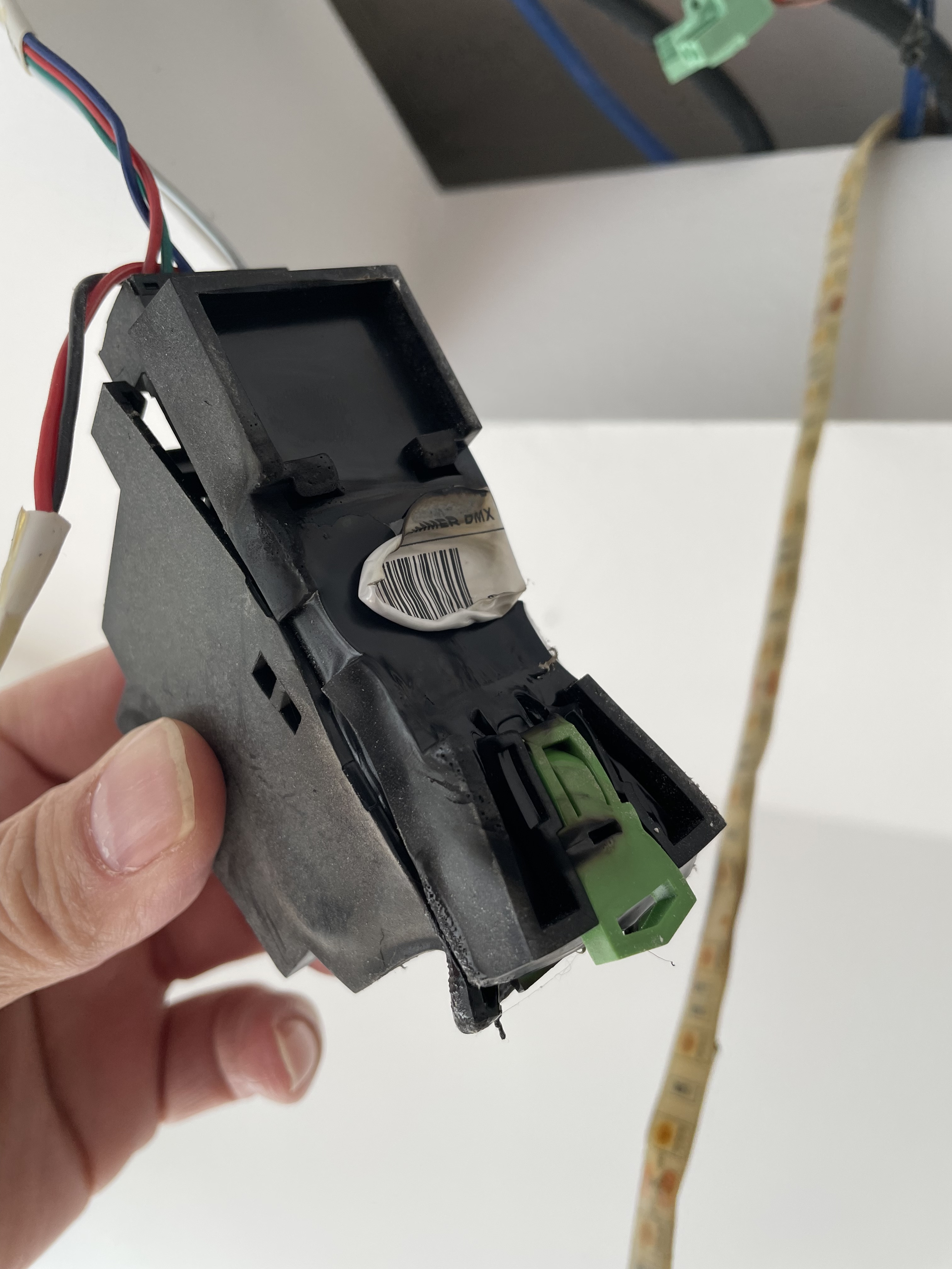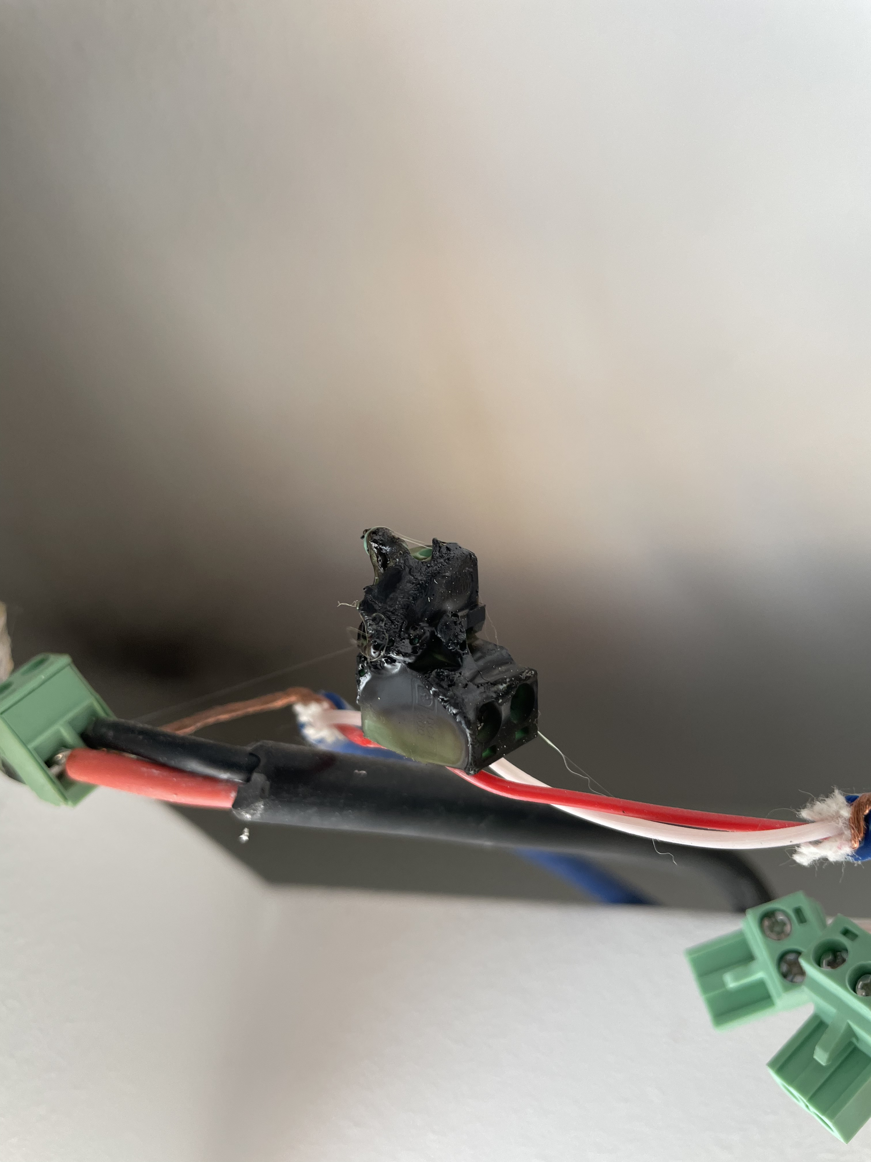 Heute waren wir beim Nachbarn und bin kurz zurück um eine Sonnenbrille zu holen. Dabei ist mir ein Geruch von verbranntem Kunststoff aufgefallen. Nach ein paar Minuten des Suchens ist mir dann ein Knistergeräusch und dann auch kleine Flammenbildung in der angehängten Decke aufgefallen. Ich habe dann sofort den Strom abgeschaltet. Ich habe dann die Extensions rausgezogen und das Feuer ist dann selbst gleich ausgegangen.