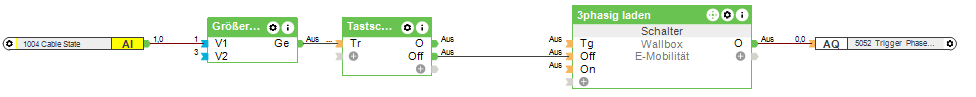 Rückfall auf 1P nach Beendigung: Hier habe ich erstmal im Wallboxbaustein vorgegeben, dass er nach Beendigung des Ladevorgangs auf "Überschussladen" stellt. Ich habe einen Taster in der Garage, den ich drücke um direkt mit 11kW zu laden (Eingang Sm1). Drücke ich den Taster vor Anstecken des Autos, dann springt die Box vor Ladebeginn auf 3P/11kW. Drücke ich erst später, dann unterbricht er natürlich kurz die Ladung und schaltet erst dann um.
