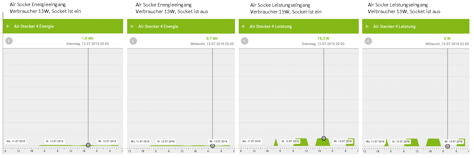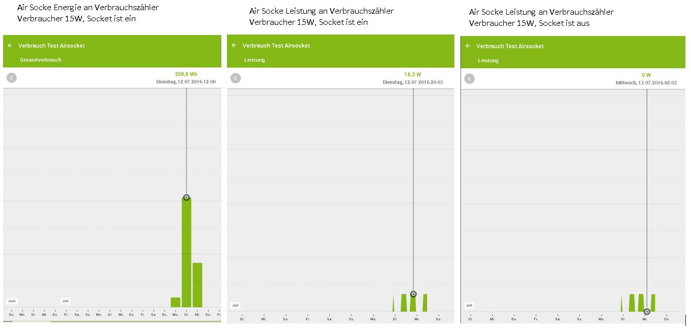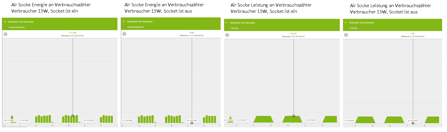 Test: Ein einfacher Verbraucher, der nicht gedimmt oder ähnliches wird also über die komplette Laufzeit die gleiche Leistung "zieht" also auch einen gleichbleibenden Verbrauch hat (habe das auch mit einen 1,7W Magnetventil nachstellen können, müssen also keine 100W-Glühbirnen sein :-) ), an eine SmartSocket hängen. Leistungs- und Energieausgang lt. Doku mit einen Verbrauchszähler verbinden. Das Ganze dann entweder den ganzen Tag durchlaufen lassen oder per Schaltuhr täglich ein paar Stunden laufen lassen. Halt jeden Tag die gleiche Zeit um das besser sehen zu können. Die Statistik für den Verbrauchszähler aktivieren und dann nach ein paar Tagen mal die Statistik in Augenschein nehmen.