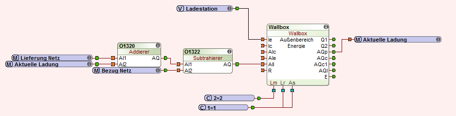 Die Summe wird bei dem Wallboxbaustein an den Eingang "All" gelegt und sagt der Wallbox, wie schnell sie laden darf.
