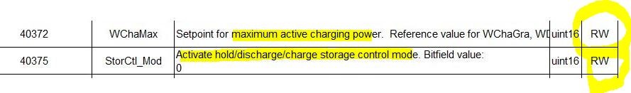 Ich habe diese Beschreibung auch, es aber nicht geschafft. Ich wäre sehr dankbar, wenn jemand der es geschafft hat mal den Modbusbefehl posten könnte. Wobei das SD Problem bliebe siehe oben. Ich schalte momentan von Loxone gesteuert über ein Relais die 230V vom SI weg, wenn ich nicht will daß er die Batterie lädt/entlädt. Nicht elegant aber mE die einzige Möglichkeit.MS mit Modbus, 1-wire, Air. Überwacht/steuert: 3xPV mit 16kWp. LiFeYPo4 8 kWh. Aquarea LWWP 5kW Split, ST und Pelletkessel. 2 BEV an Keba P20. Teilweise Beleuchtung über HomematicKommentar