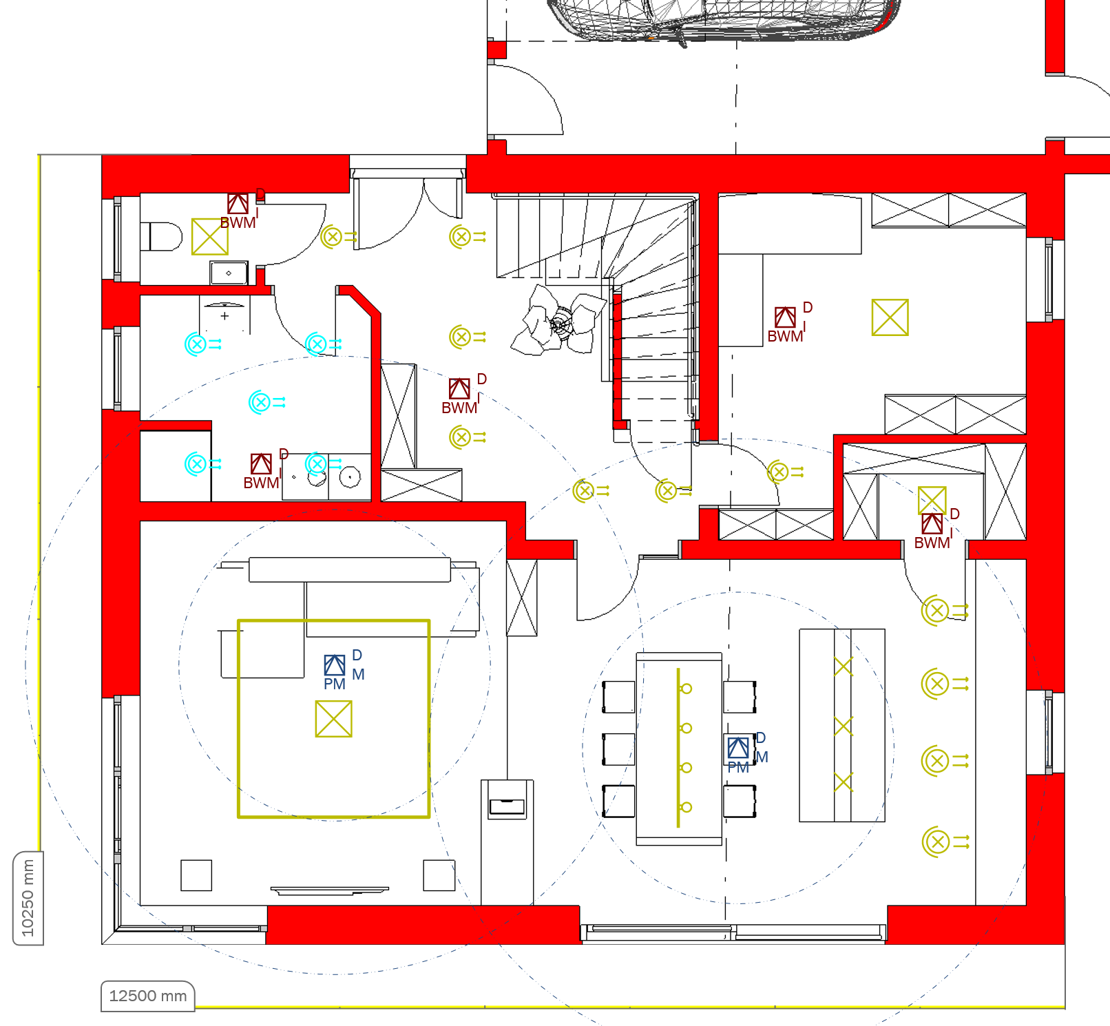 Auch beim Vorraum weiß ich nicht ob das so gehen würde. Alternative: Einen BWM zwischen die Spots bei der Haustür und einen zwischen die Spots beim Eingang in den Essbereich? Zwischen Vorraum und Essbereich sit eine Glastür. Ist das ein Problem? Ich möchte nicht, dass im Nebenraum das Licht angeht wenn man sich bewegt. Ob diese Tür immer zu ist, ist auch fraglich. Ansonsten einen BWM an der Wand im Vorraum neben der Glastür? Oder kann man die so einstellen/abkleben dass bestimmte Bereiche nicht erfasst werden?