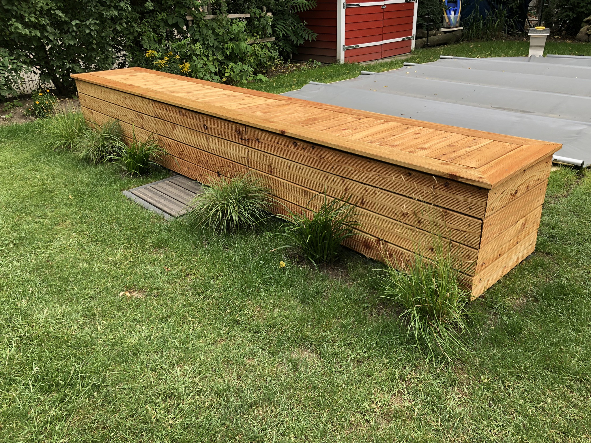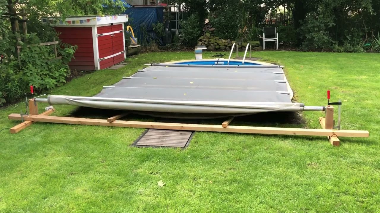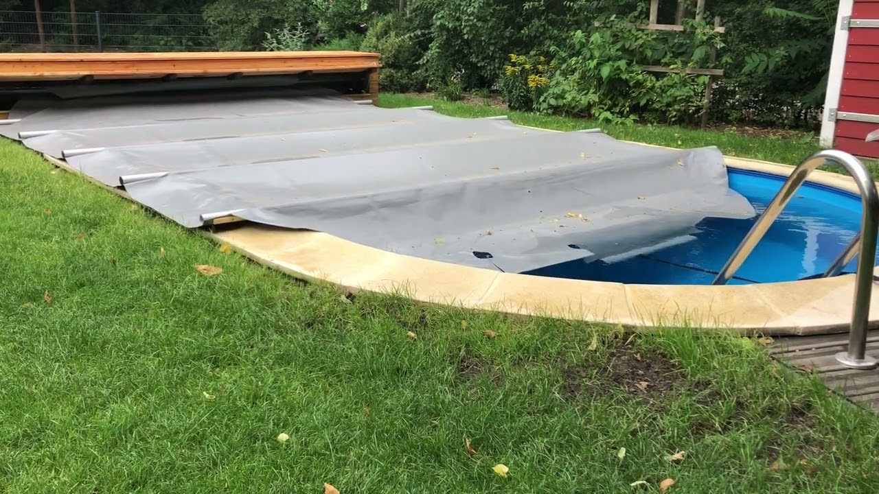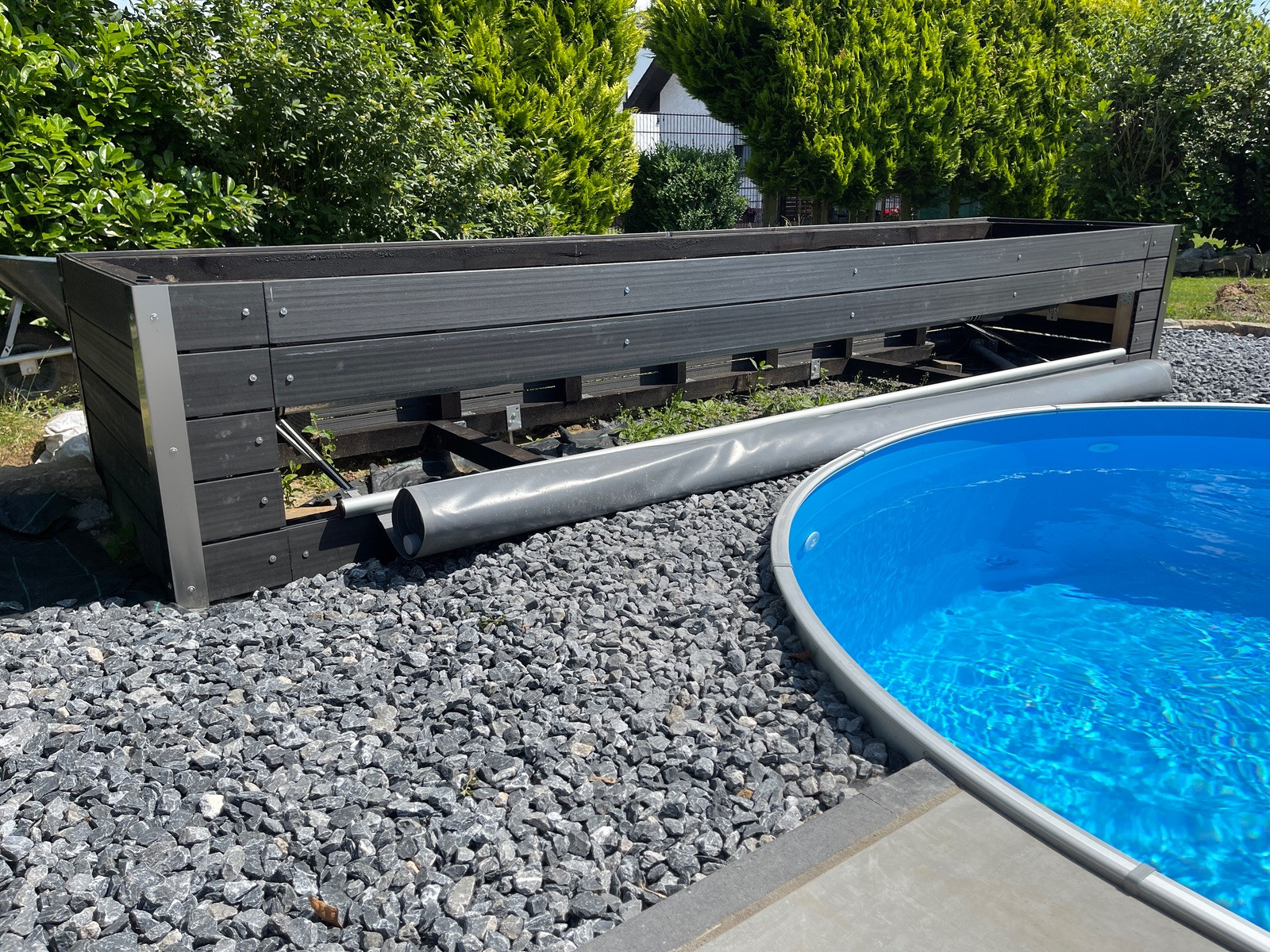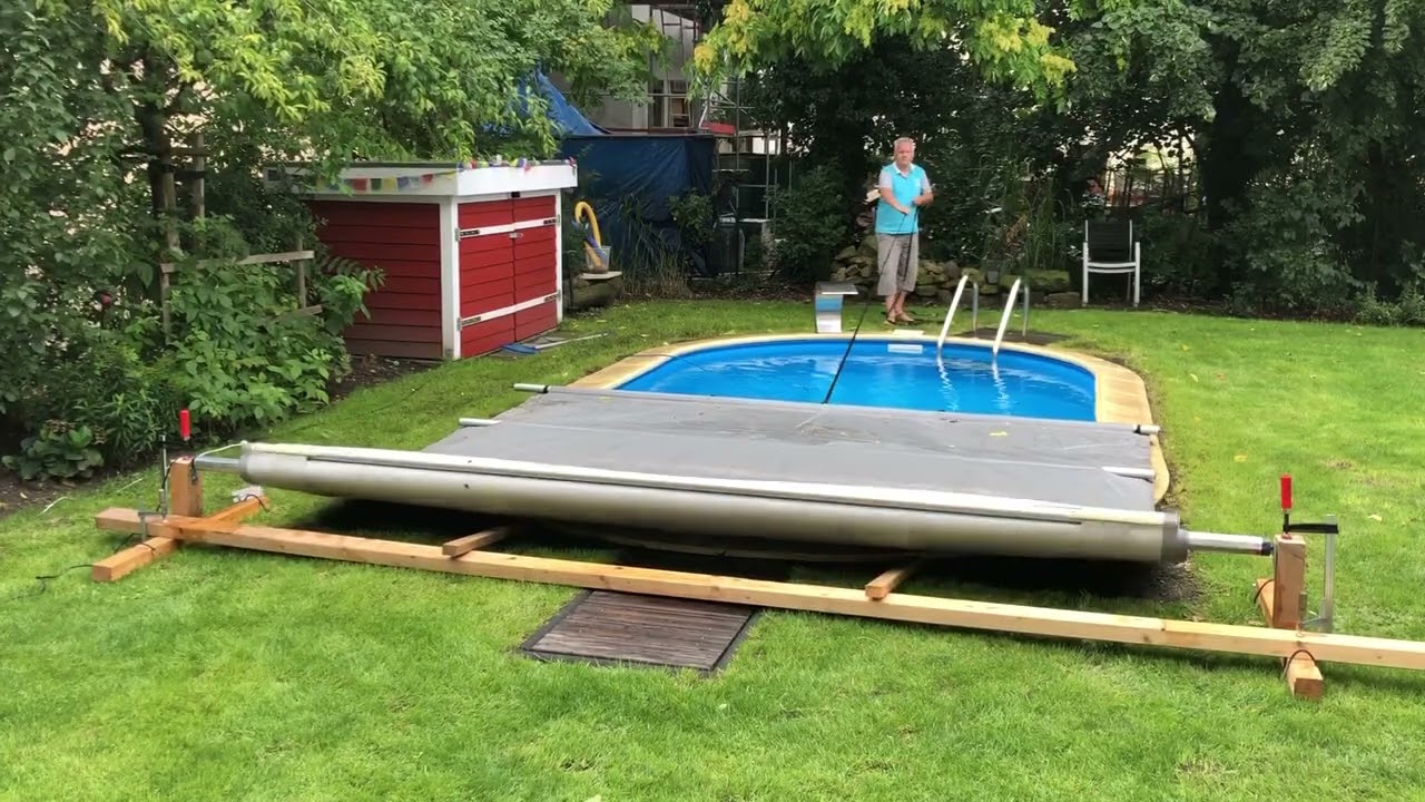 Ich stelle mir hier einen hübschen Holzkasten am Ende des Pools vor, den man gleich als Sitzbank nutzen kann. Im Inneren dann ein Rollladenantrieb, der die Stangenabdeckung beim Einziehen auf einer Welle aufrollt. Beim Ausziehen muss man dann unterstützen und die Abdeckung beim Abrollen mit ausziehen.