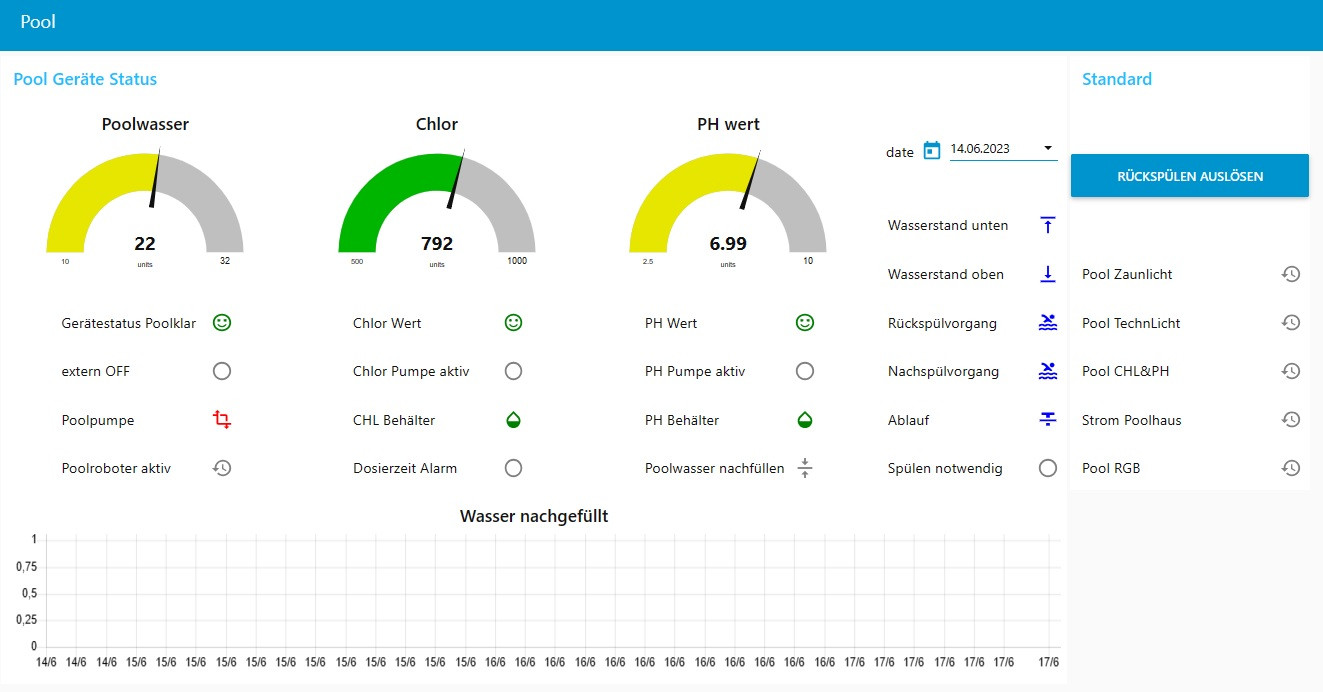 da ich grad auf meine Werte geschaut habe, hier meine Übersicht, da ich das schon früher mit einer fertigen Dosieranlage realisiert habe, hab ich alles in ein RedNode Dashboard zusammengefasst, auf der Zeitleiste unten sehe ob und wann Wasser nachgefüllt wurde, vielleicht noch eine Anregung für jemanden dabei?