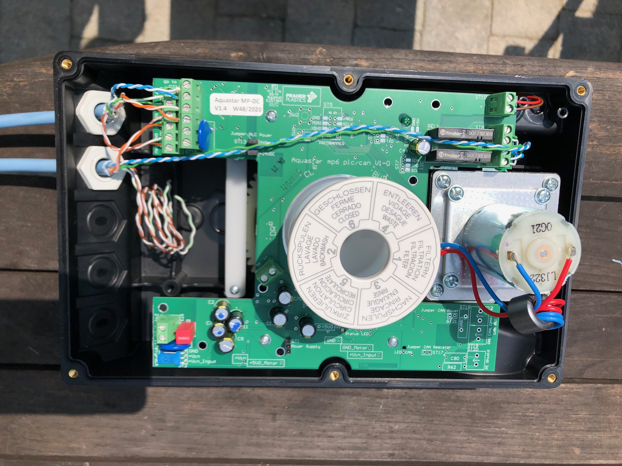 Ich habe quasi nur den Antrieb von Praher und das bei meinem Filter mitgelieferte 6-Wege-Ventil weiterverwendet. Das ging problemlos. So sieht es aufgebaut und angeschlossen aus: