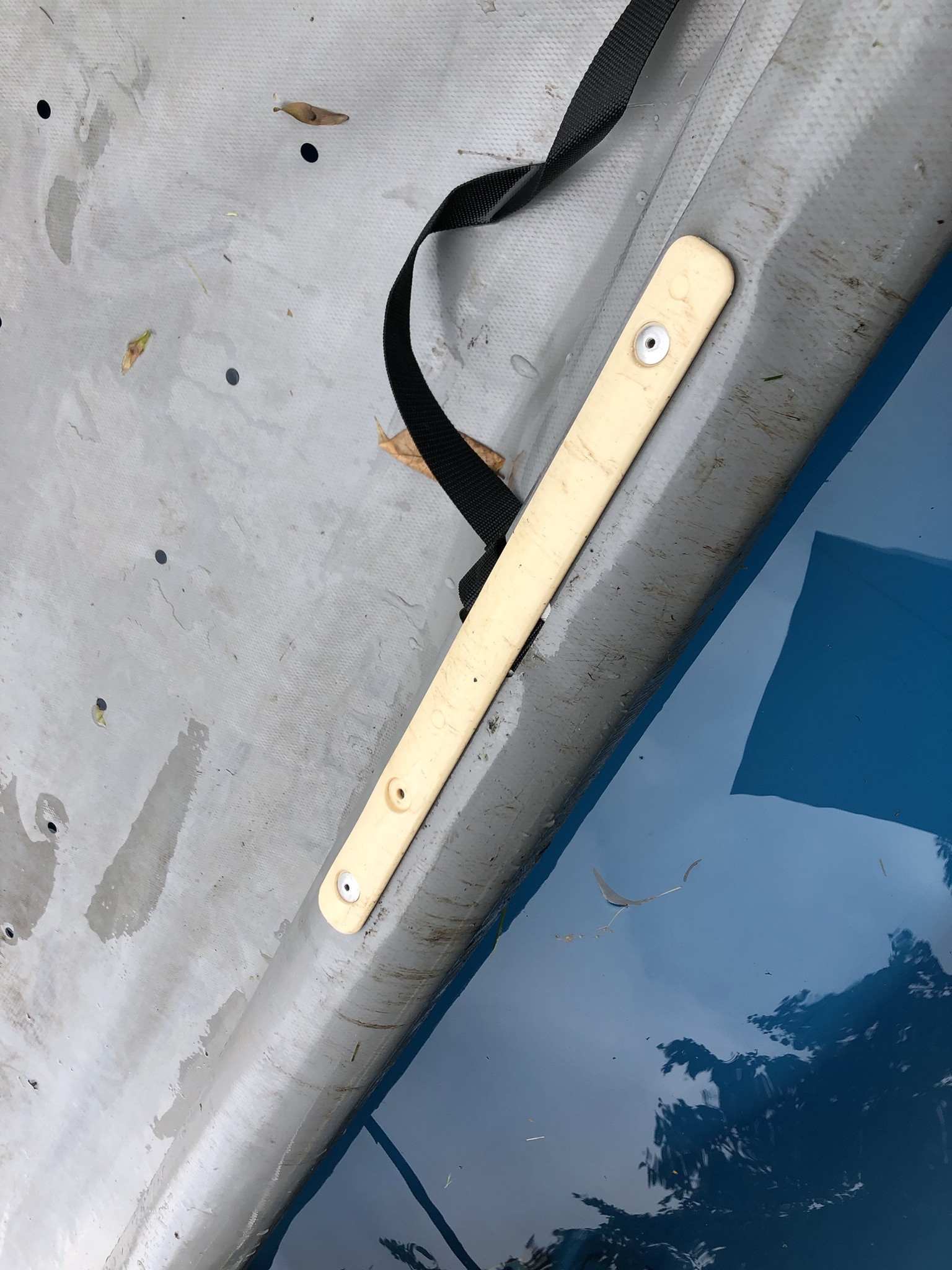 Ich überlege, ob ich unter die Stangen noch kleine Rollen (Röllchen) baue. Mal sehen. Auf jeden Fall bin ich froh, dass wir die Abdeckung mit Verstärkung gekauft haben. Das sind diese Kunststoffgleiter unter den Stangen und im Bereich der Randsteine eine zusätzliche Lage Folie. Ansonsten hätte ich arge Bedenken, dass die Abdeckung das Ziehen über die rauen Randsteine lange mitmacht.