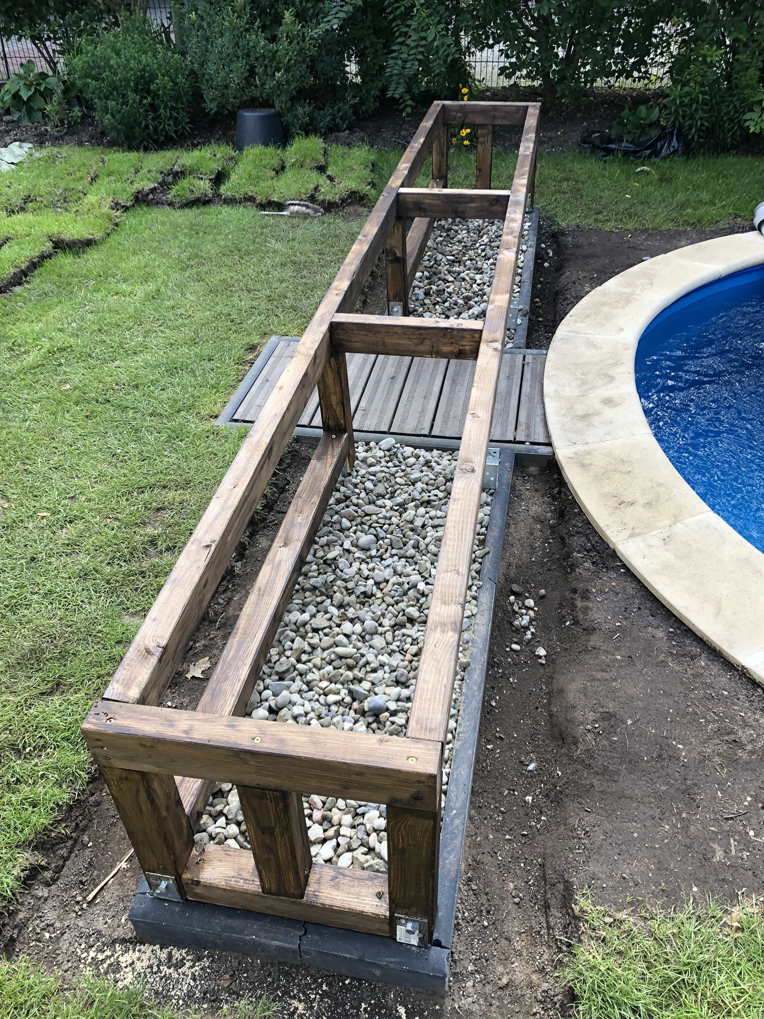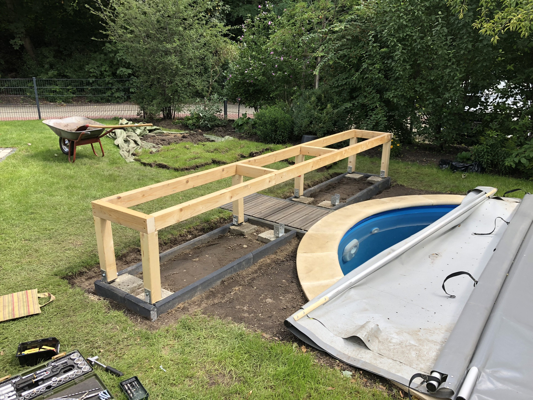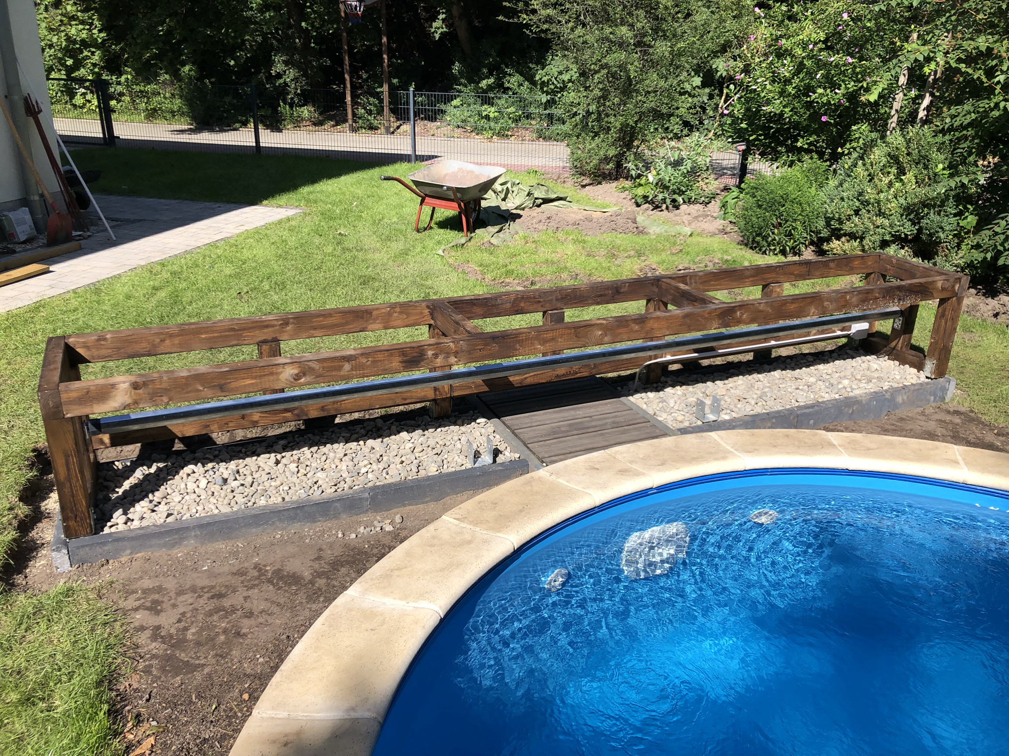 Das Fundament bilden Punktfundamente, wo ich insgesamt 8 Pfostenanker einbetoniert habe. Darum Rasenkantsteine im Betonbett. Aufgefüllt ist das Ganze mit Kies, damit Regen- und Poolwasser versickern kann. Auf den Bildern sieht man noch den Schacht meiner Gegenstromanlage - der hat natürlich mit der Abdeckung nichts zu tun
