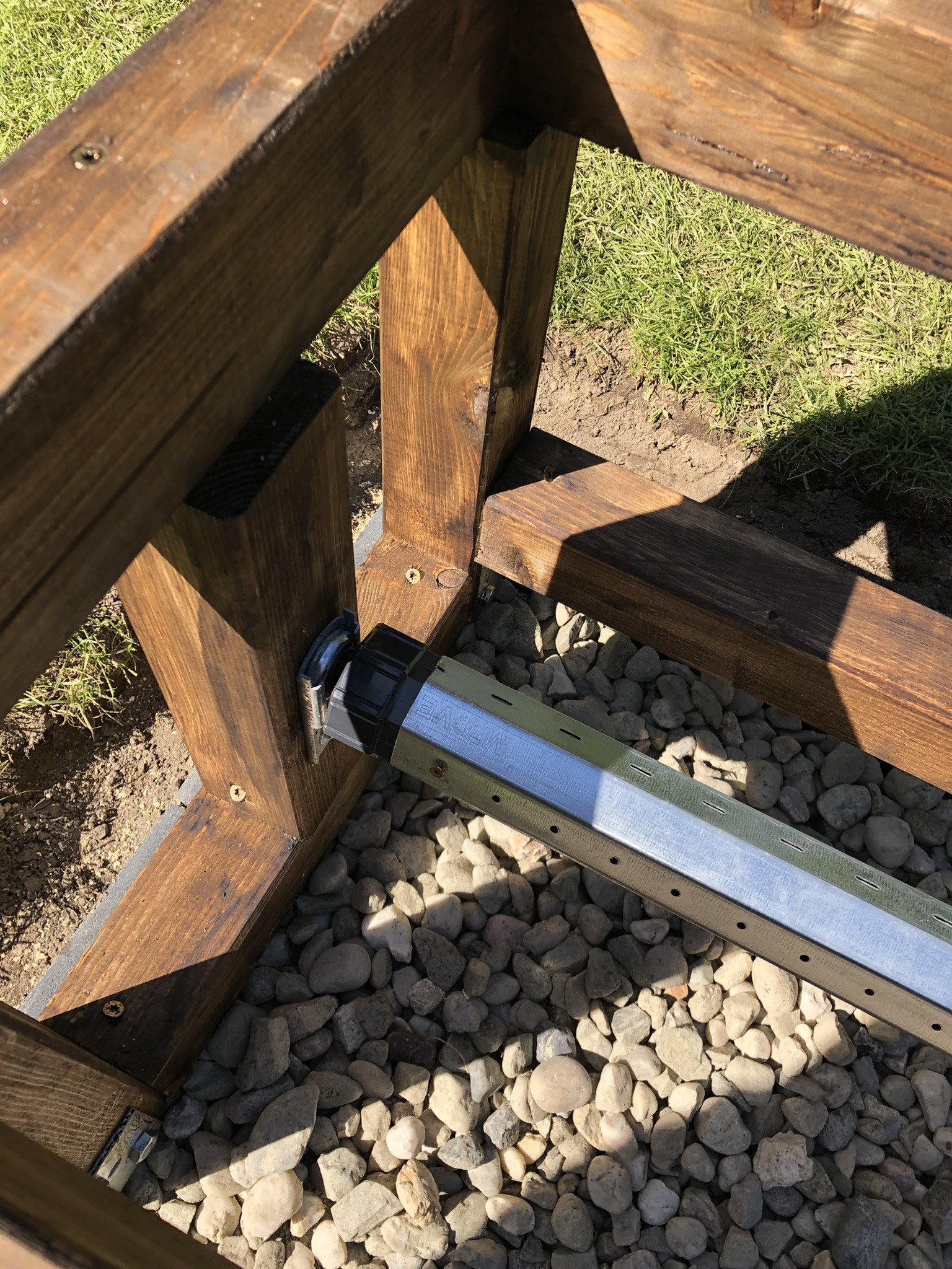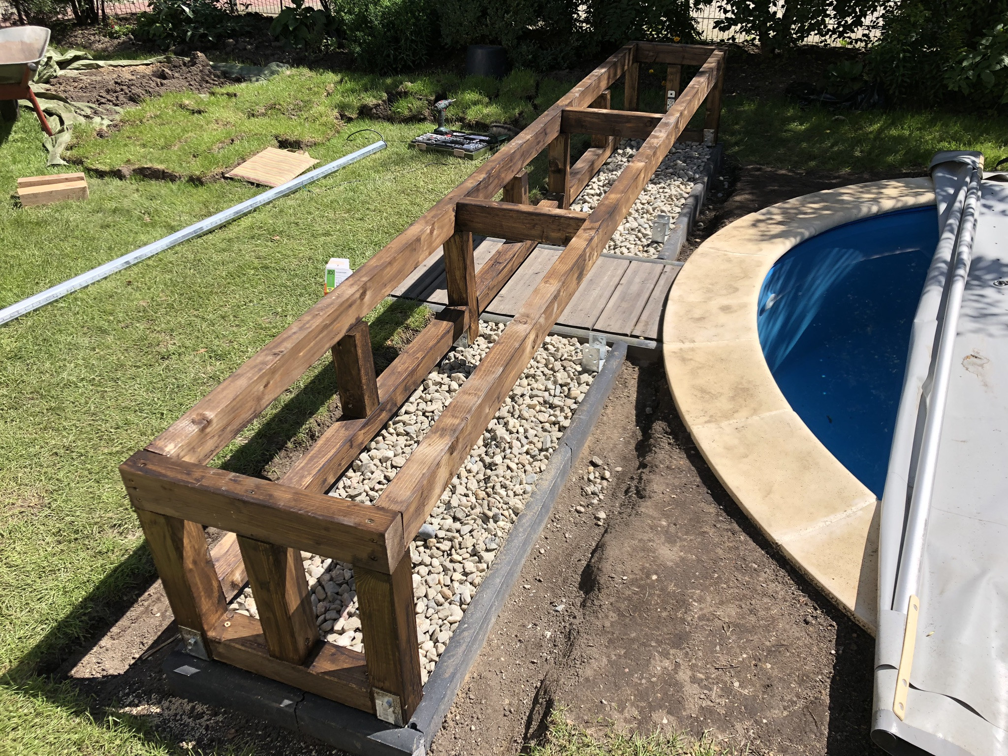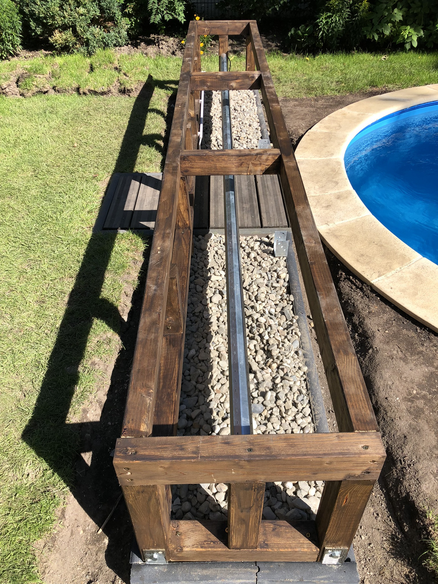Das Fundament bilden Punktfundamente, wo ich insgesamt 8 Pfostenanker einbetoniert habe. Darum Rasenkantsteine im Betonbett. Aufgefüllt ist das Ganze mit Kies, damit Regen- und Poolwasser versickern kann. Auf den Bildern sieht man noch den Schacht meiner Gegenstromanlage - der hat natürlich mit der Abdeckung nichts zu tun