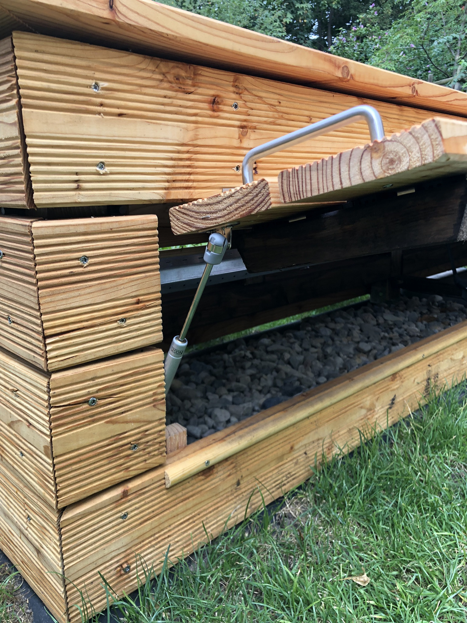Die Klappe vorne wird von zwei Gasdruckfedern von Amazon nach oben gehalten. Hier habe ich die 200N Variante gewählt und davon zwei Stück verbaut. Die Klappe wiegt dabei 12 kg. Laut Produktbeschreibung sollten die Gasdruckfedern bis 20 kg schaffen, das stimmt so aber nicht. Kleiner als 200N dürfen sie bei 12 kg nicht sein. So halten sie aber sicher die Klappe oben.