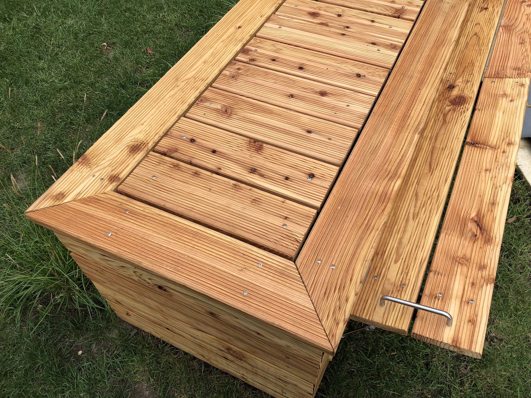 Als Pfostenmaterial habe ich 80x80 mm Kanthölzer verwendet, der "Ringanker" oben ist aus 60x100mm Kantholz. Beschläge, Scharniere etc. sind aus Edelstahl aus dem gut sortierten Baumarkt.