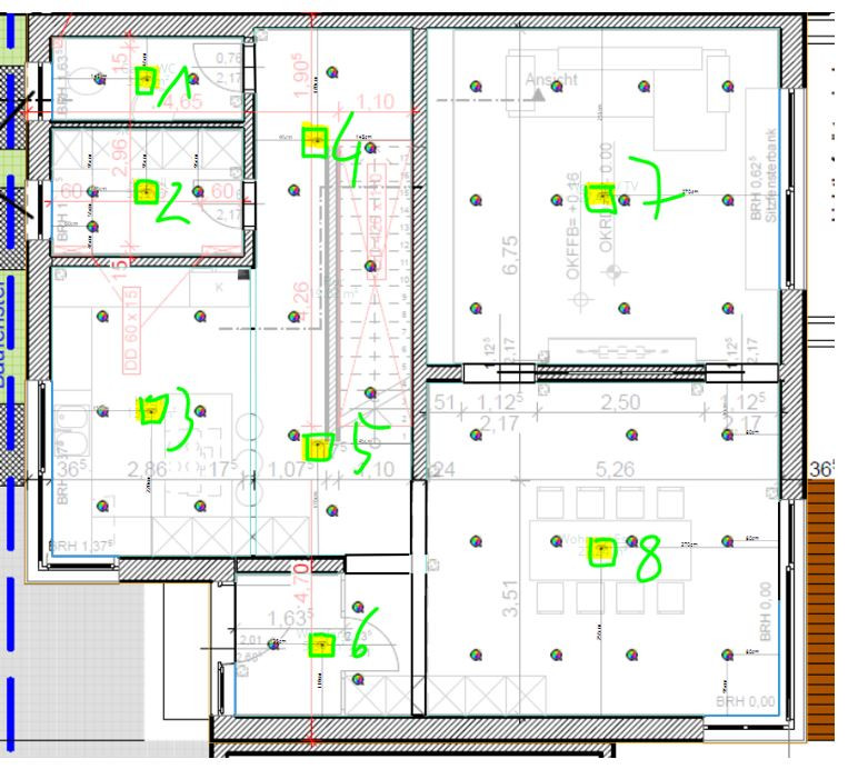 ich habe mit UPLAN einen Entwurf für die Lage der Präsenzmelder erstellt welches automatisch diese positioniert hat. Da ich morgen die Decke frei geben möchte mit den Halox Dosen - seht ihr hier noch Handlungsbedarf bzw. Anpassungen die nötig sind ? Die RGBW Spots können ignoriert werden!