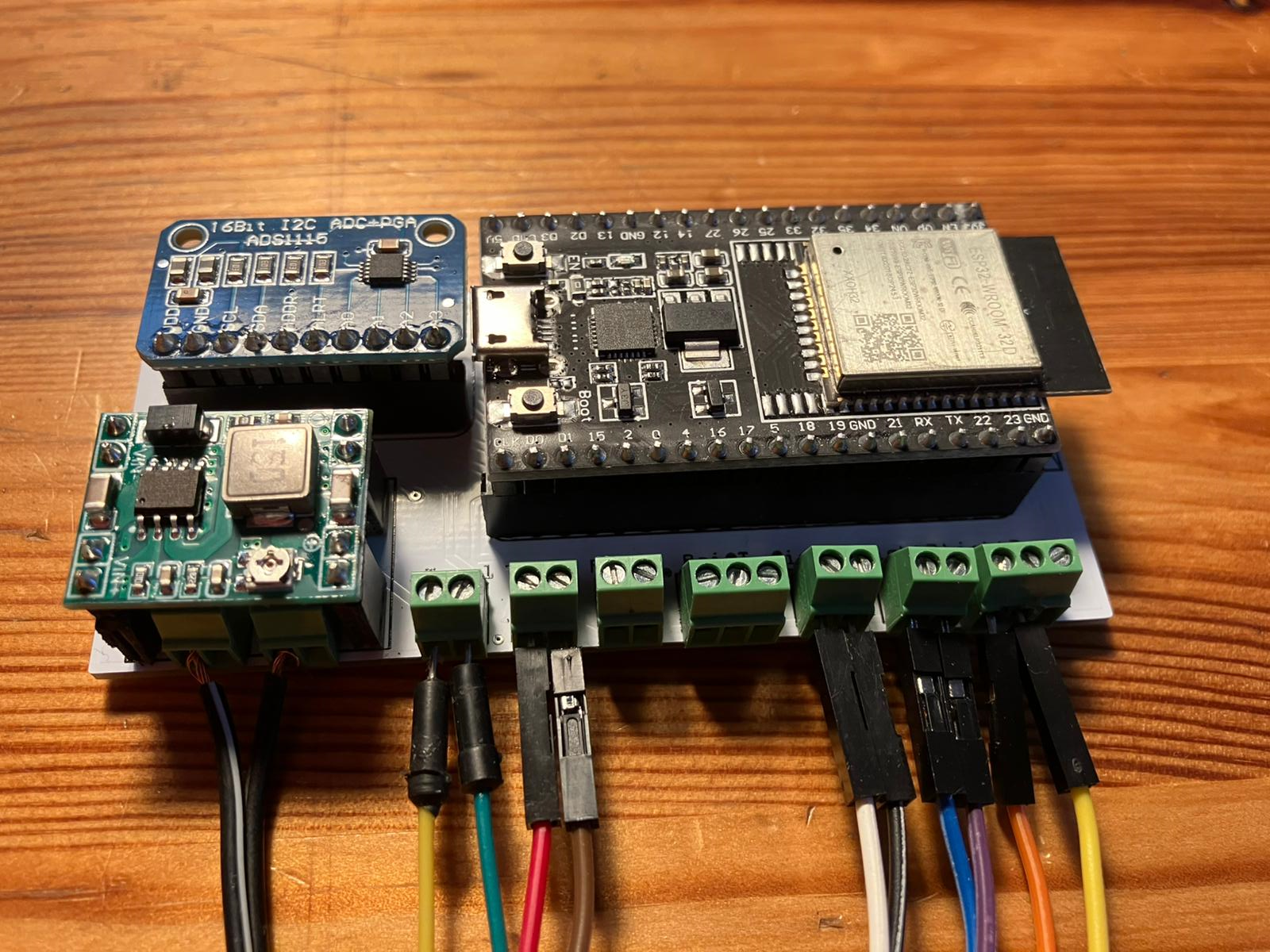 Der ESP32 sitzt auf einer kleinen Platine, die die I/Os des ESP32 auf einen Standard Raspberry Header "umkonvertiert". Damit passt dann auch unsere selbst entworfene Platine 1:1 auf Raspberry und ESP32. Dazu ist dann eine kleine Stromversorgung gekommen, die die 12V Eingangsspannung in 5V herunterwandelt. Die kann natürlich deutlich kleiner (und damit günstiger) als die für den Raspberry ausfallen.