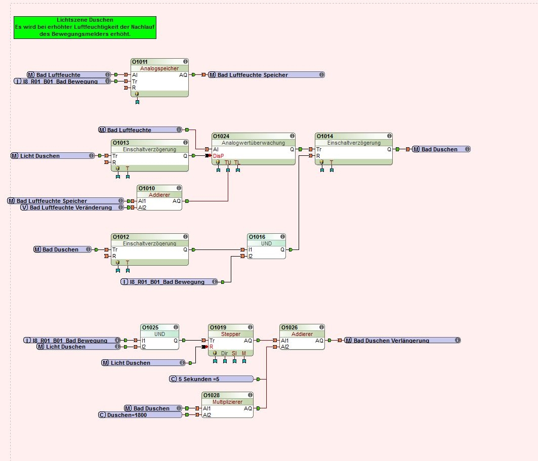 Im Badezimmer habe ich einen Präsenzmelder. Bei "Nichtaktivität" schaltet somit das Licht nach ca. 4 Minuten wieder aus. Nun gibt es aber immer mal wieder Fälle, wo das Licht ausschaltet, während ich in der Dusche bin. Der PM reagiert somit nicht.