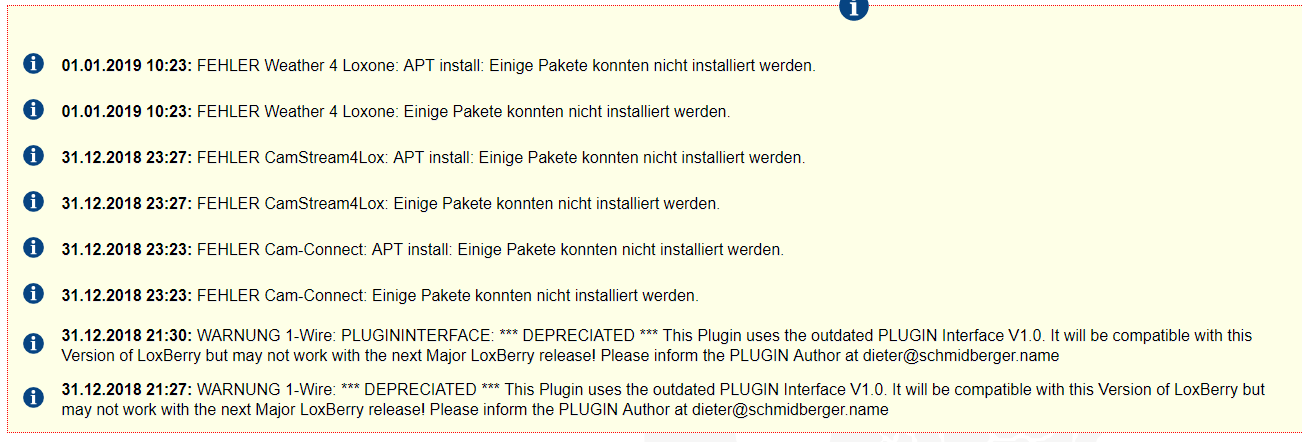 Nach ca. 20 Minuten das erste Plugin installiert (1-Wire) und gleich eine Fehlermeldung erhalten (siehe Pic 1) - hab dann noch drei weitere Plugins installiert, bei allen wird nicht alles installiert und es kommt bei allen der gleiche Fehler (siehe Pic 2).
