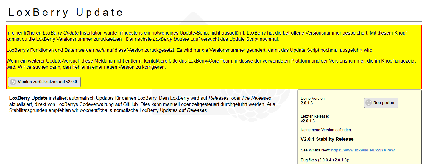 ich wollte den heute regnerischen Sonntag für den längst fälligen Schritt von Loxberry 1.4.3 auf Version 2 nutzen. Nach der Installation von 2.0.0 sah eigentlich alles gut aus. Nach dem Schritt auf 2.0.1.3 sah das Ganze dann aber leider weniger gut aus:
