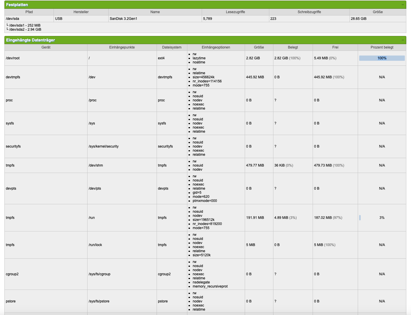 {"target":"/boot", "source":"/dev/mmcblk0p1", "fstype":"vfat", "options":"rw,relatime,fmask=0022,dmask=0022,codepage=437,iocharset=ascii,shortname=mixed,errors=remount-ro"}
