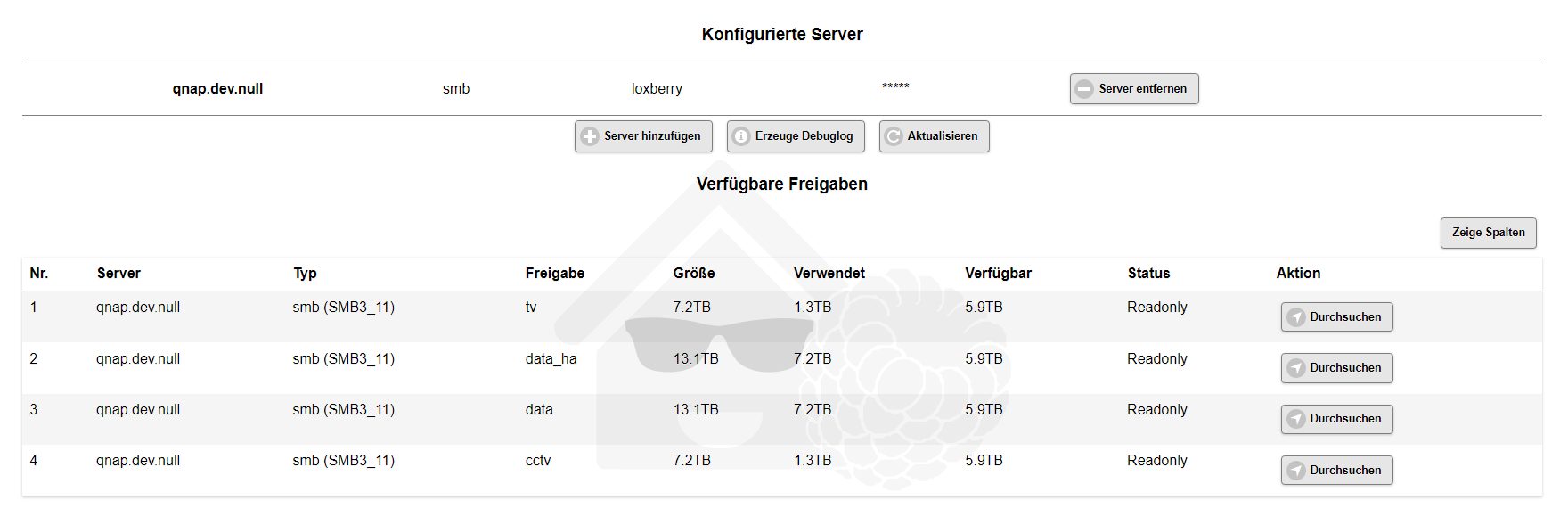 Ich habe mein NAS über die Netzwerkfreigabe von LoxBerry eingebunden. Auf dem NAS sind insgesamt 4 Freigaben eingerichtet und der User loxberry hat im / jeweils nur Leserechte: