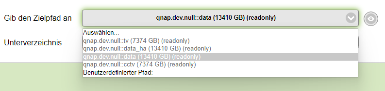 In der Config zeigt er mir die CIFS-Shares nur ausgegraut an, mutmaßlich, weil er sie als read-only identifiziert hat, so dass ich nur "Benutzerdefinierter Pfad" auswählen kann: