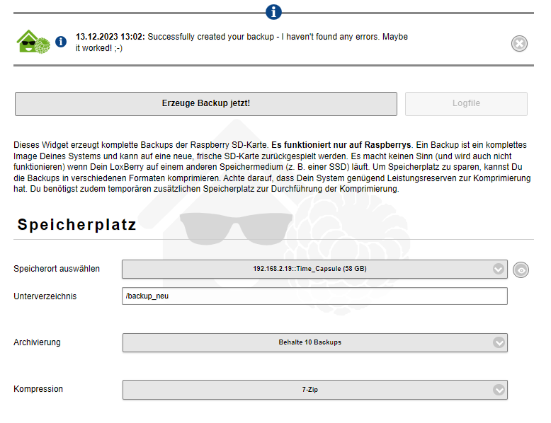Ich hab seit einiger Zeit ein recht stabiles Loxberry laufen und mir wäre natürlich sehr daran gelegen ein Backup davon zu haben. Leider bekomme ich beim Backup seit einiger Zeit die Meldung: